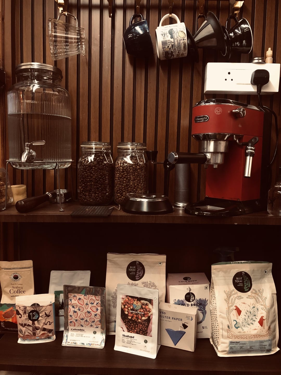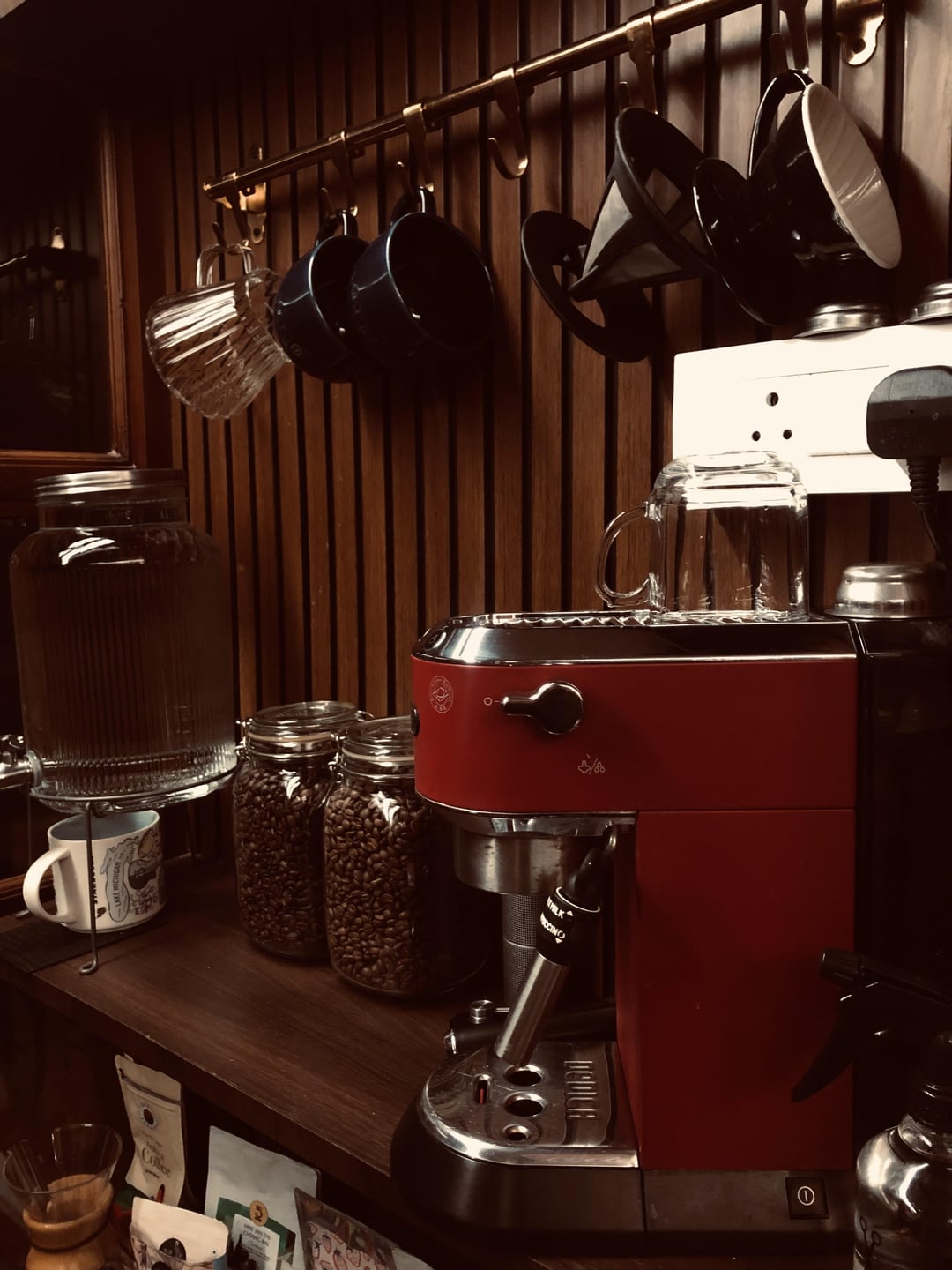 My setup at the office that I designed some time back. Here’s what’s going on here: 1. Dedica EC685 2. Aero press 3. A few pour over kit 4. Medium and dark roasts collected from various places.