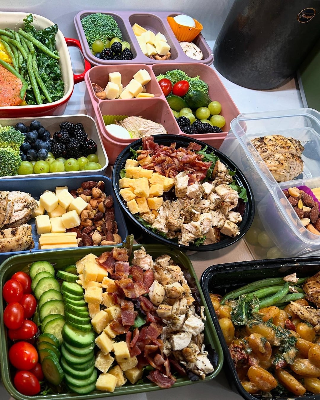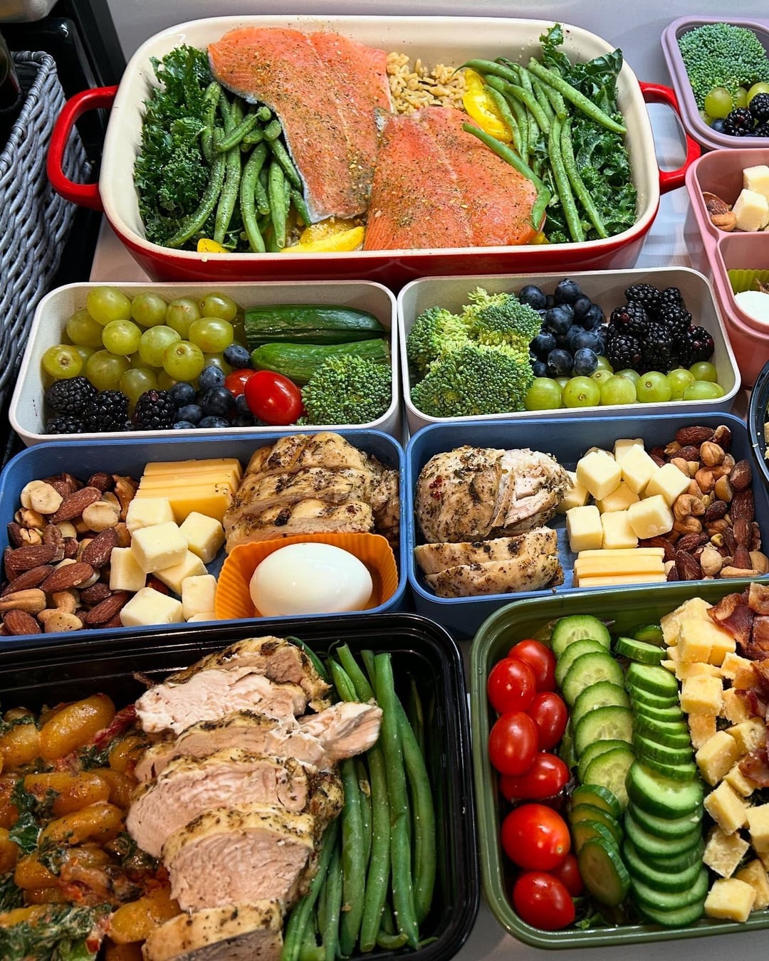 Salmon bake, protein boxes, chicken gnocchi, salad. The blue and grey boxes are stackable bento boxes.