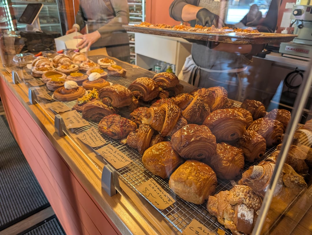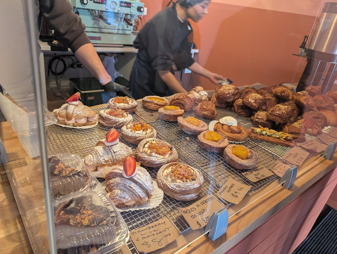 It feels like everyone and their mother has been waiting in line for Del Sur pastries, so I thought I would finally make it out to Fat Peach. I had guessed right, there were only 4 people ahead of me at open! So many of the goodies made me audibly go wow. I especially loved the mango custard (circle top right), the strawberry cream croissant with such great strawberry flavor (not too sweet!), and the cinnamon roll – a flaky masterpiece. They also have this genius breakfast croissant with ham, cheese, and a whole hash brown in there.