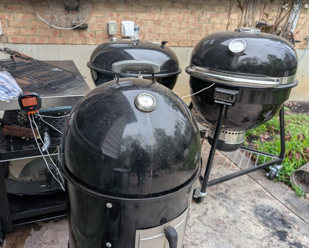 I planned to make all of this on my new-to-me WSM but quickly realized there wasn't nearly enough room and I didn't feel like using the toothpick method, so I fired up the kettle and Summit Kamado as well. B&B briquettes in all 3, snake method in the Smokey Mountain and Kettle and the minion method in the Summit with the diffuser plate. Water bowl was in the WSM but no water added. Kettle was used offset with the top vent on the side of the meat, occasionally rotated a few degrees. Added pecan chunks to each and used my Inkbird with probes on each grate to monitor temps. Initially the temps "spiked" to about 170F but I was able to get the WSM and WSK to hold very steadily at 155-160F with almost no adjustments, while the kettle wanted to go out if I let it go that low so I had to keep it around 170-180F and it took much more fiddling with the vents.