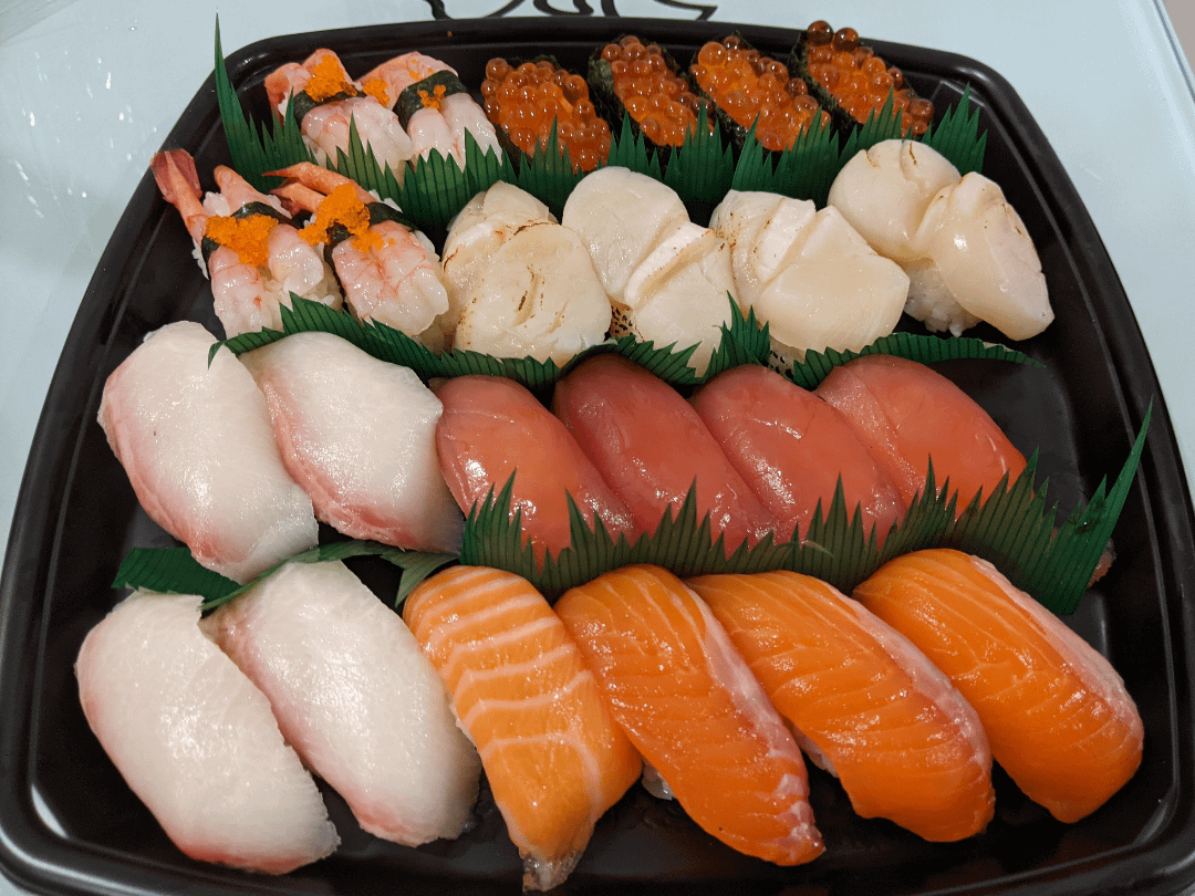 24 pieces of nigiri from Costco in Taiwan. $495NT or $15.20. The salmon and tuna are just okay compared to what you can get here. Yellowtail, scallops, and ikura were really nice. Stingy with the soy sauce and wasabi. Two tiny packets for all this, but you can ask for more from the deli people.
