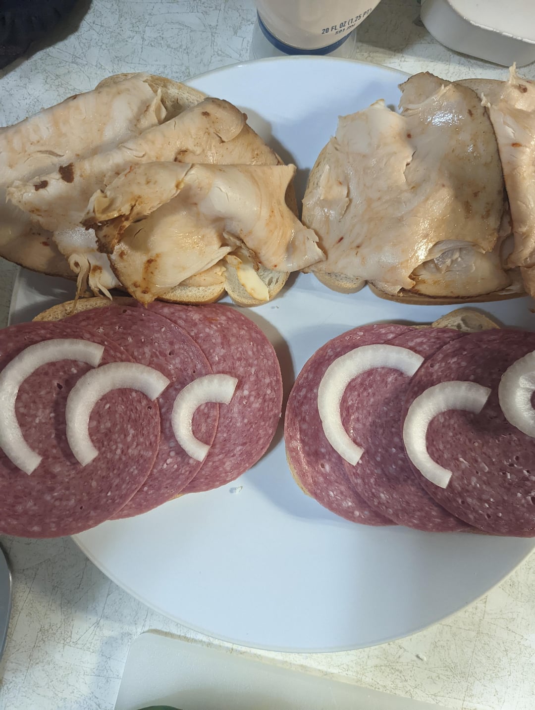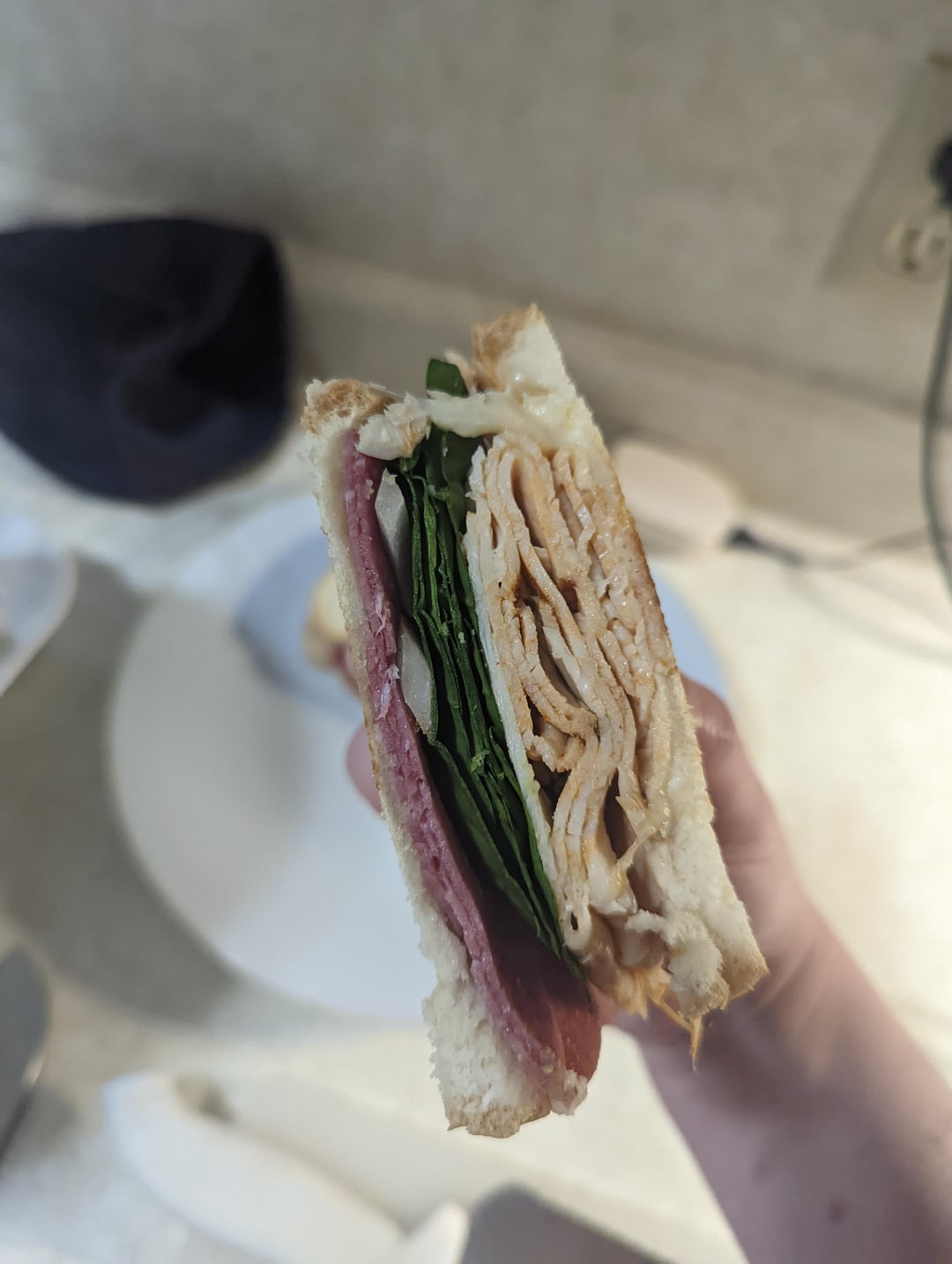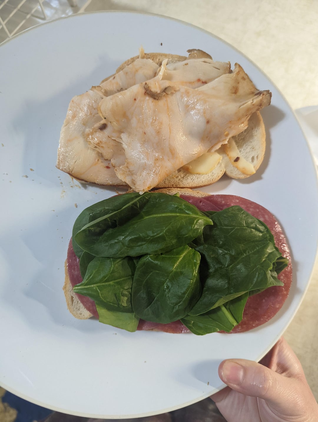 Buffalo chicken, salami, Munster cheese, (not enough) mayo, spinach and onion.