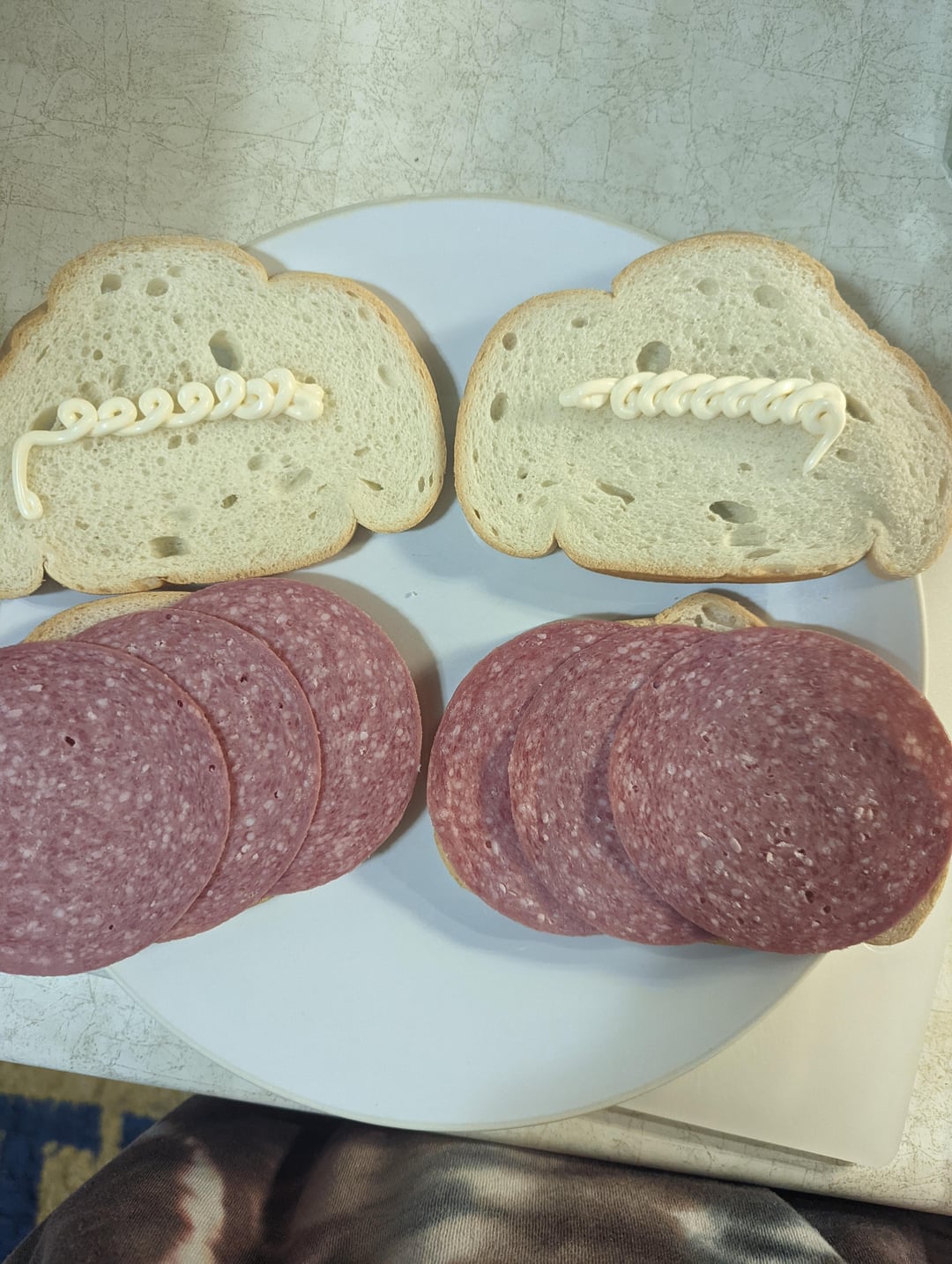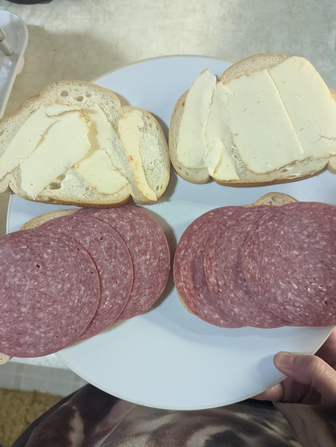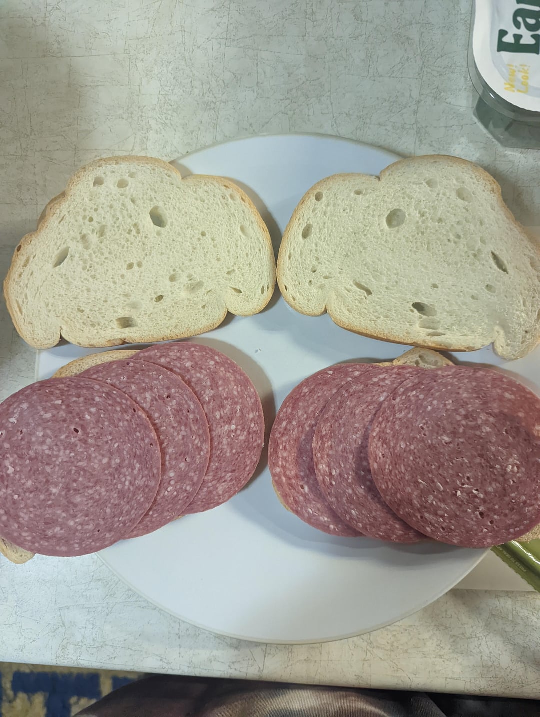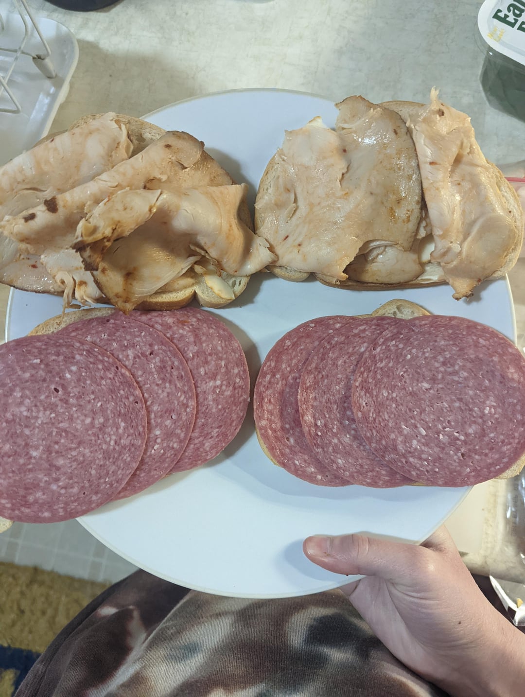 Buffalo chicken, salami, Munster cheese, (not enough) mayo, spinach and onion.