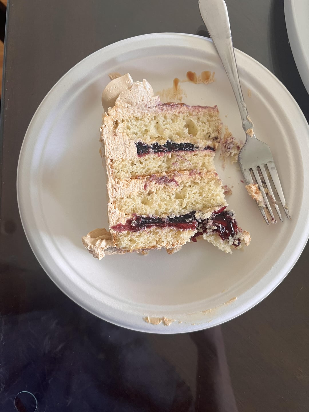 It’s vanilla cake, caramel Swiss meringue buttercream, and blueberry jam.