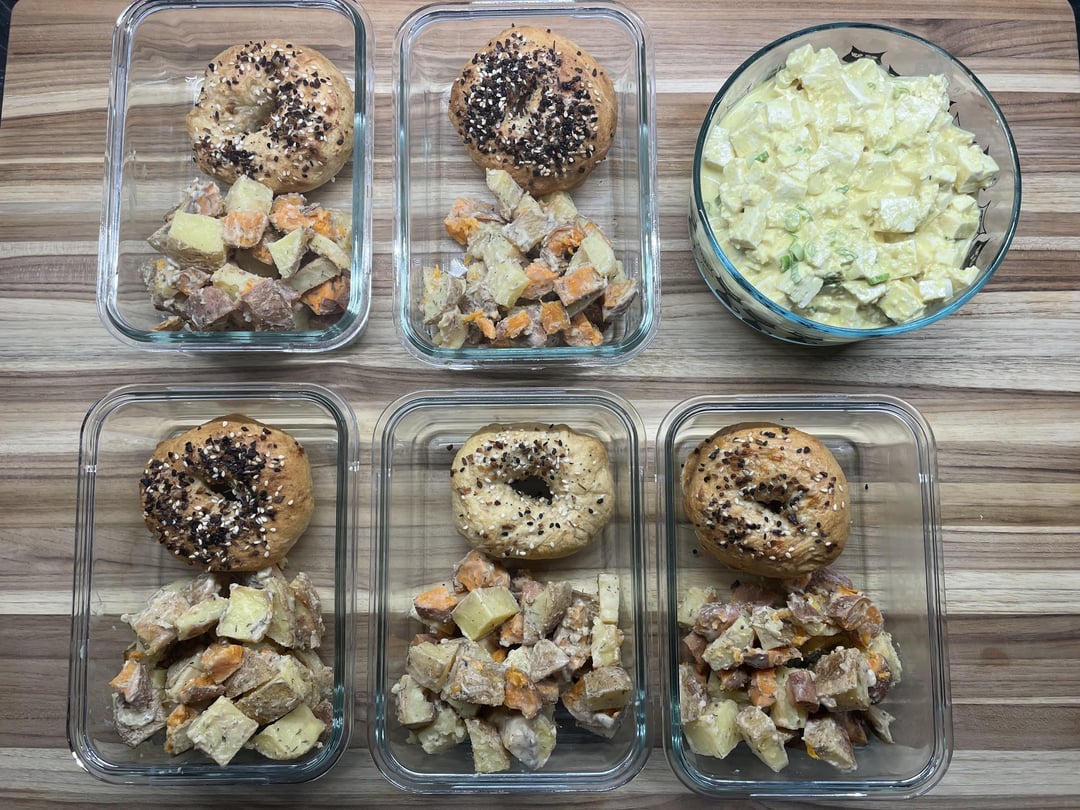 for breakfast, i made tofu “egg” salad (cubed tofu, mayo, couple green onions, nutritional yeast, and black salt. measure with your heart) and potato salad (https://minimalistbaker.com/easy-roasted-potato-salad-with-garlic-dill-dressing/#wprm-recipe-container-81280), which i am serving with bagels i made a couple weeks ago as well as some salad greens.