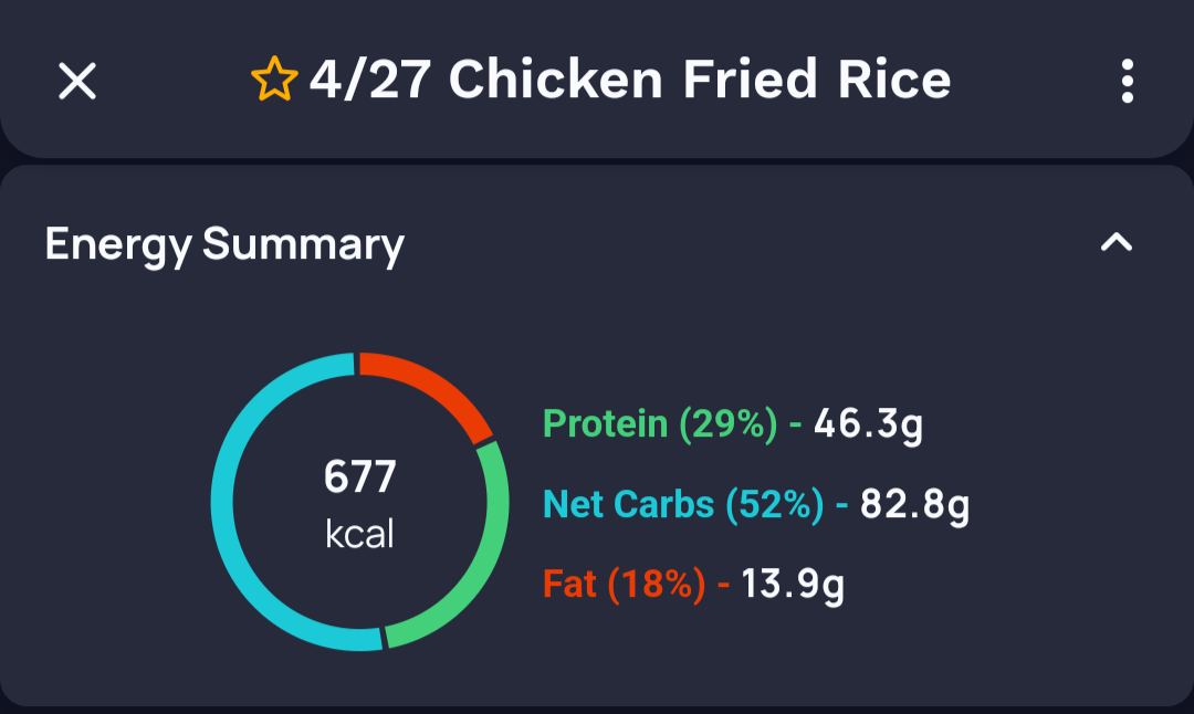 I actually over calculated my recipe, ended up with 14 portions instead of 12, so I had an extra day of fried rice prepared (I eat one serving for 5 days, my partner does 1.4 servings for 5 days)