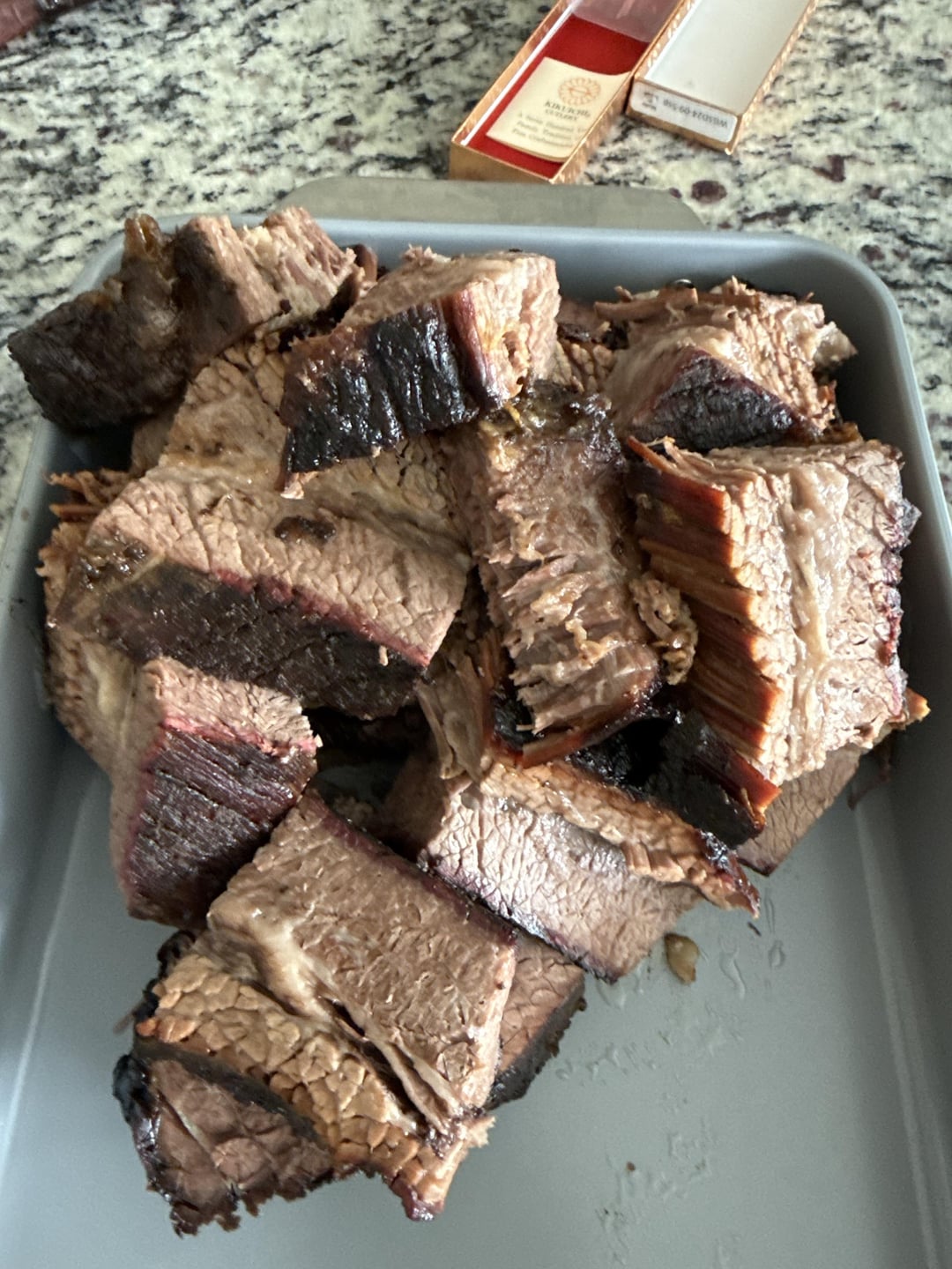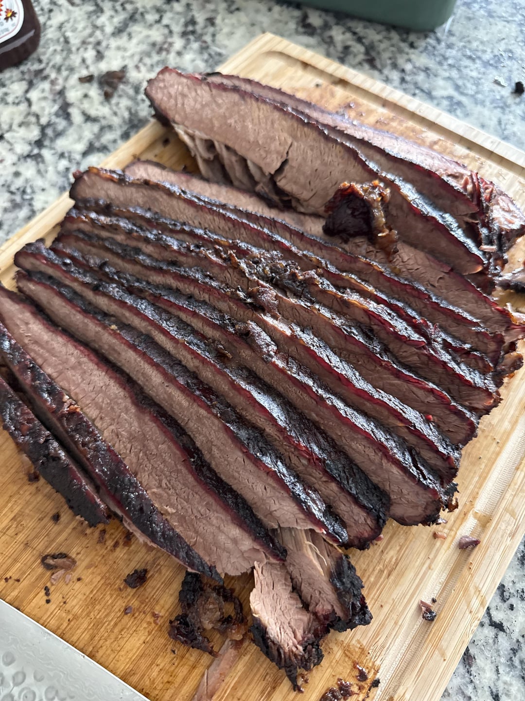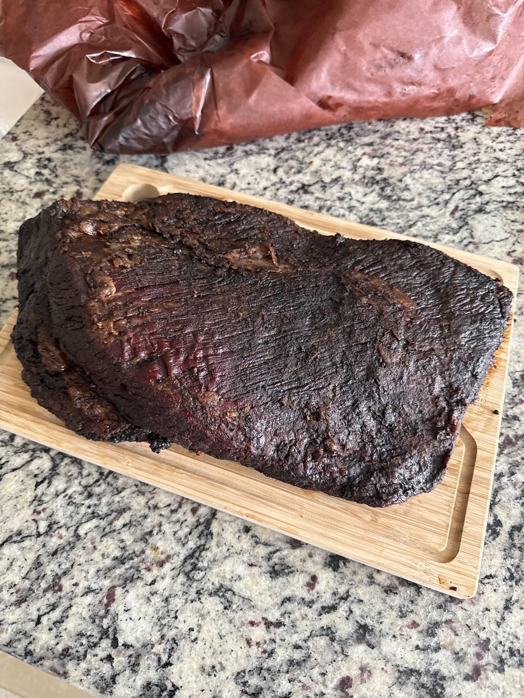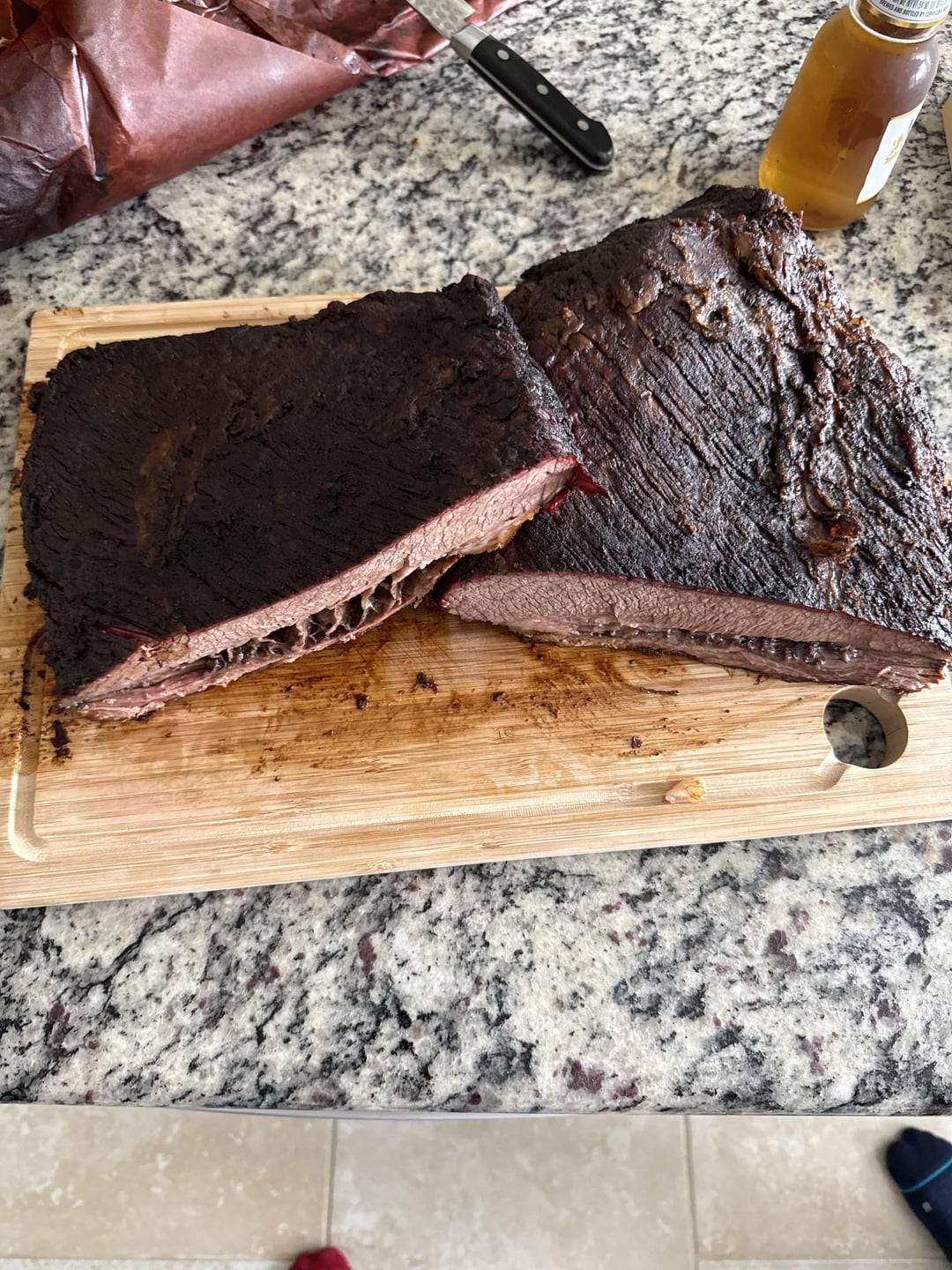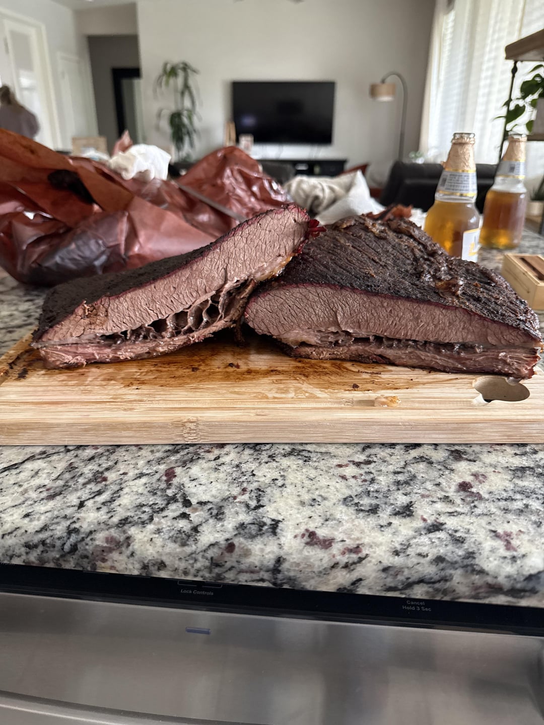 Looks good for the first time around! A bit on the dry side based on the photos but definitely good bark. I would say for next time around, try putting the probes near the middle or closer to the flat than the point. The other thing I personally do is I smoke with fat cap up instead of down.