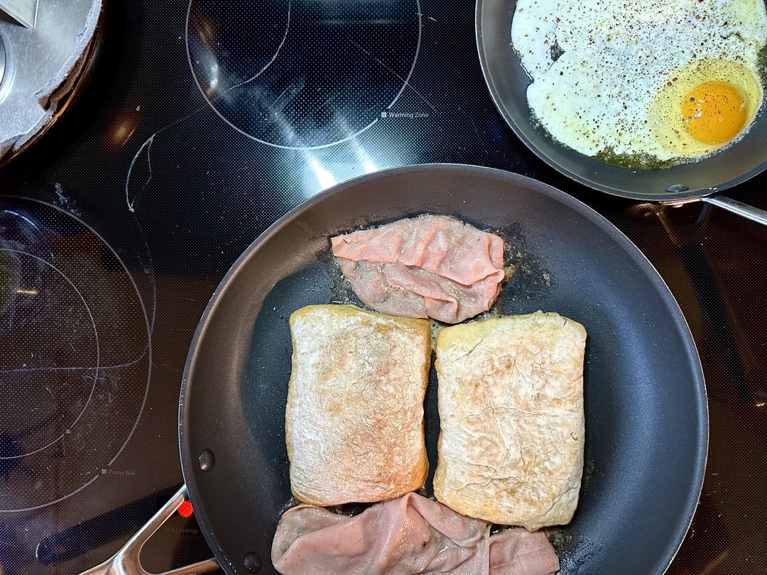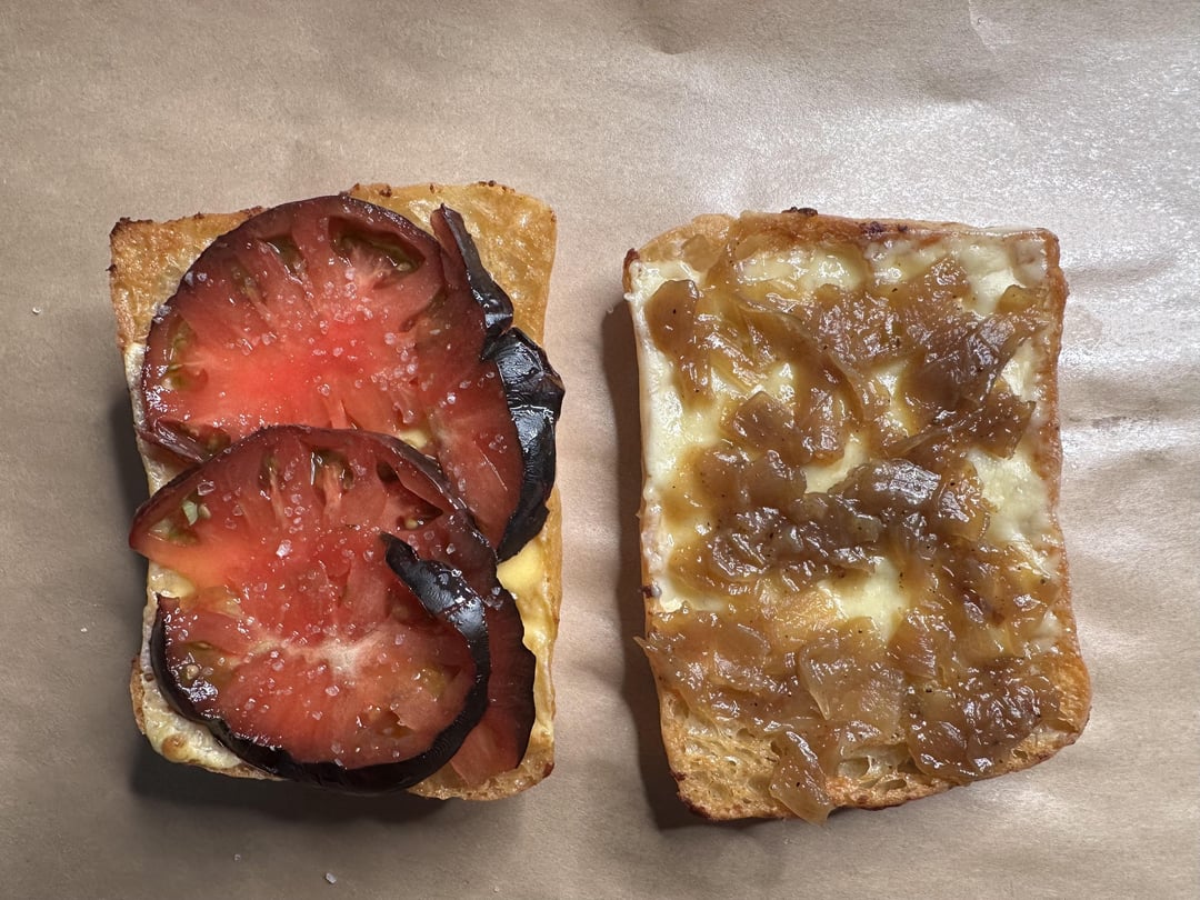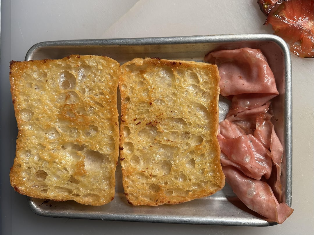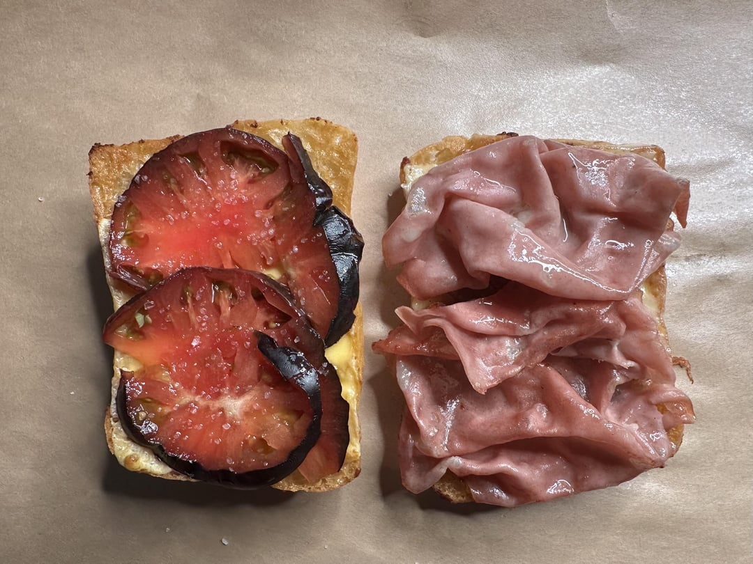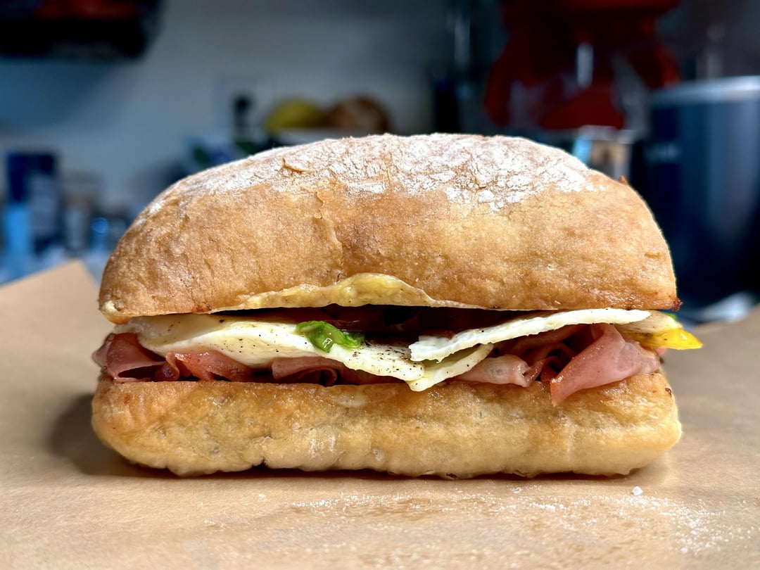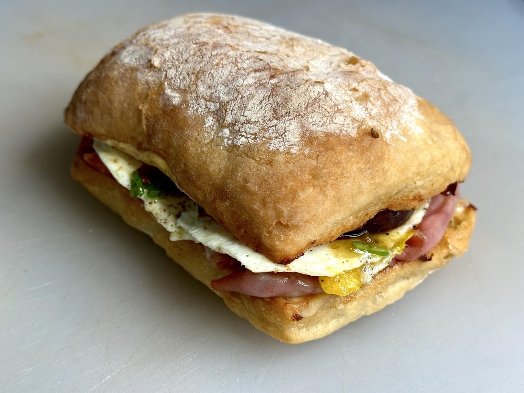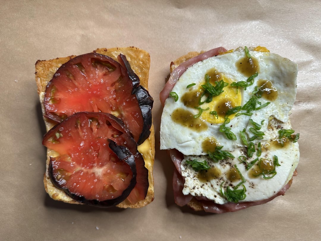 Fried eggs, American and Gouda cheese, pan-fried mortadella, caramelized onions, heirloom tomato, and mango verde hot sauce, on a buttered and griddled homemade ciabatta roll.