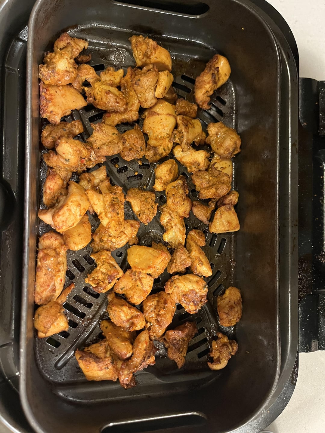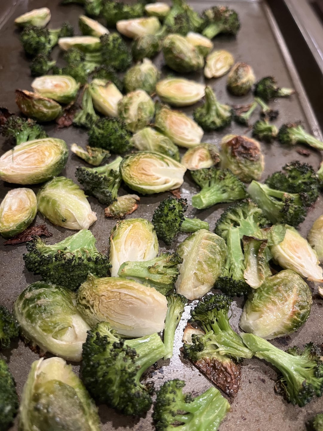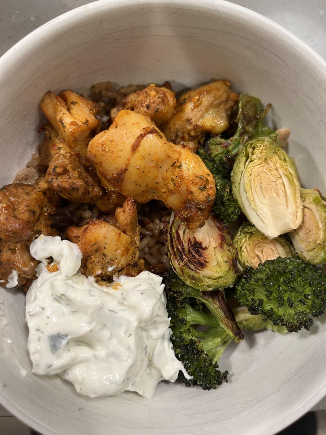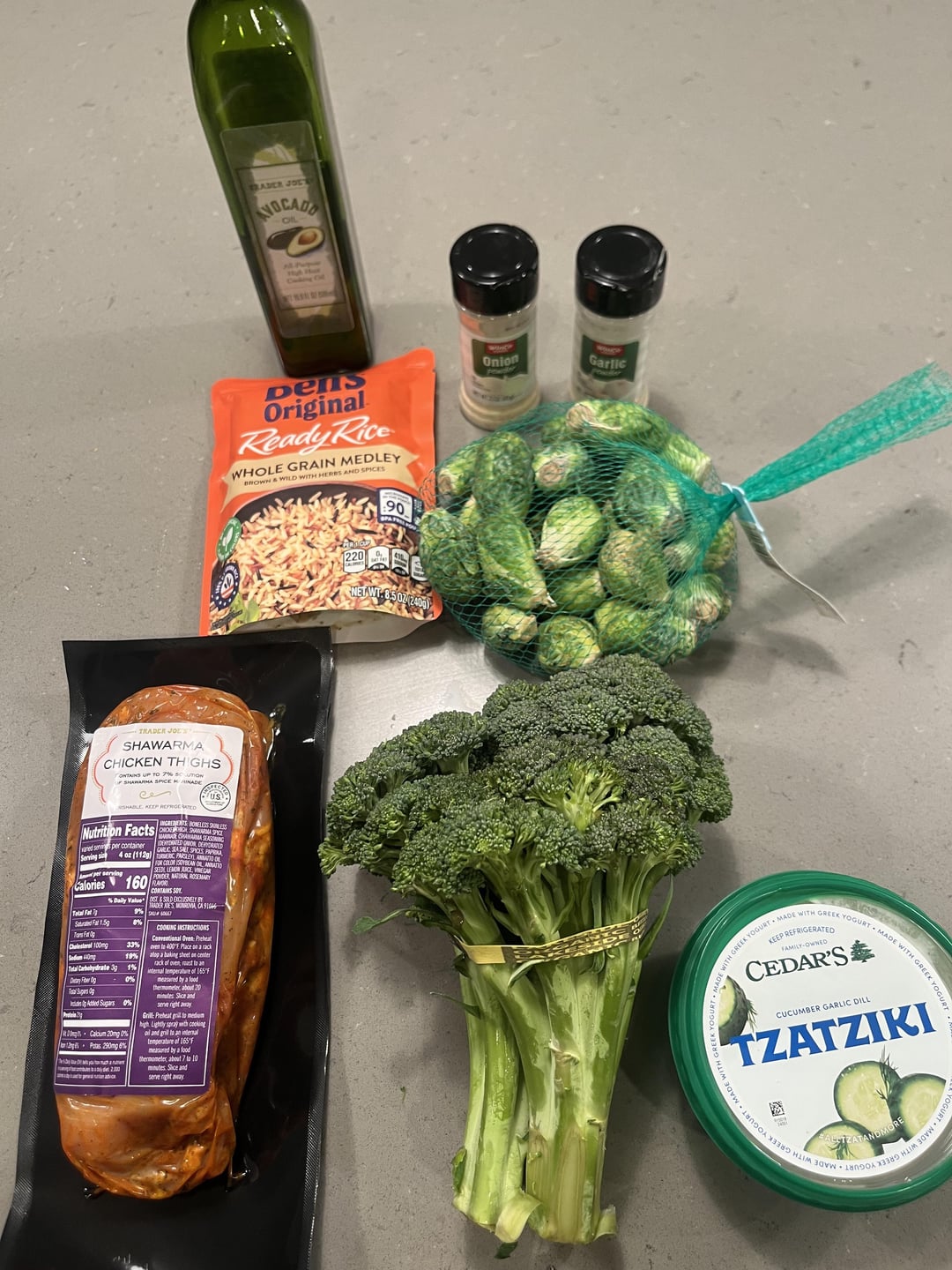 I got the shawarma pre marinated chicken thighs at Trader Joe’s this week and popped them in the air fryer for 15 minutes. I added some broccoli and Brussels sprouts to a pan seasoned with avocado oil, garlic, and onion powder and then warmed up some rice.