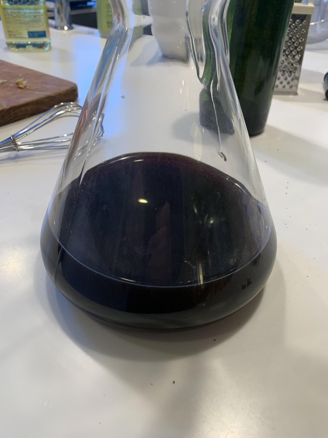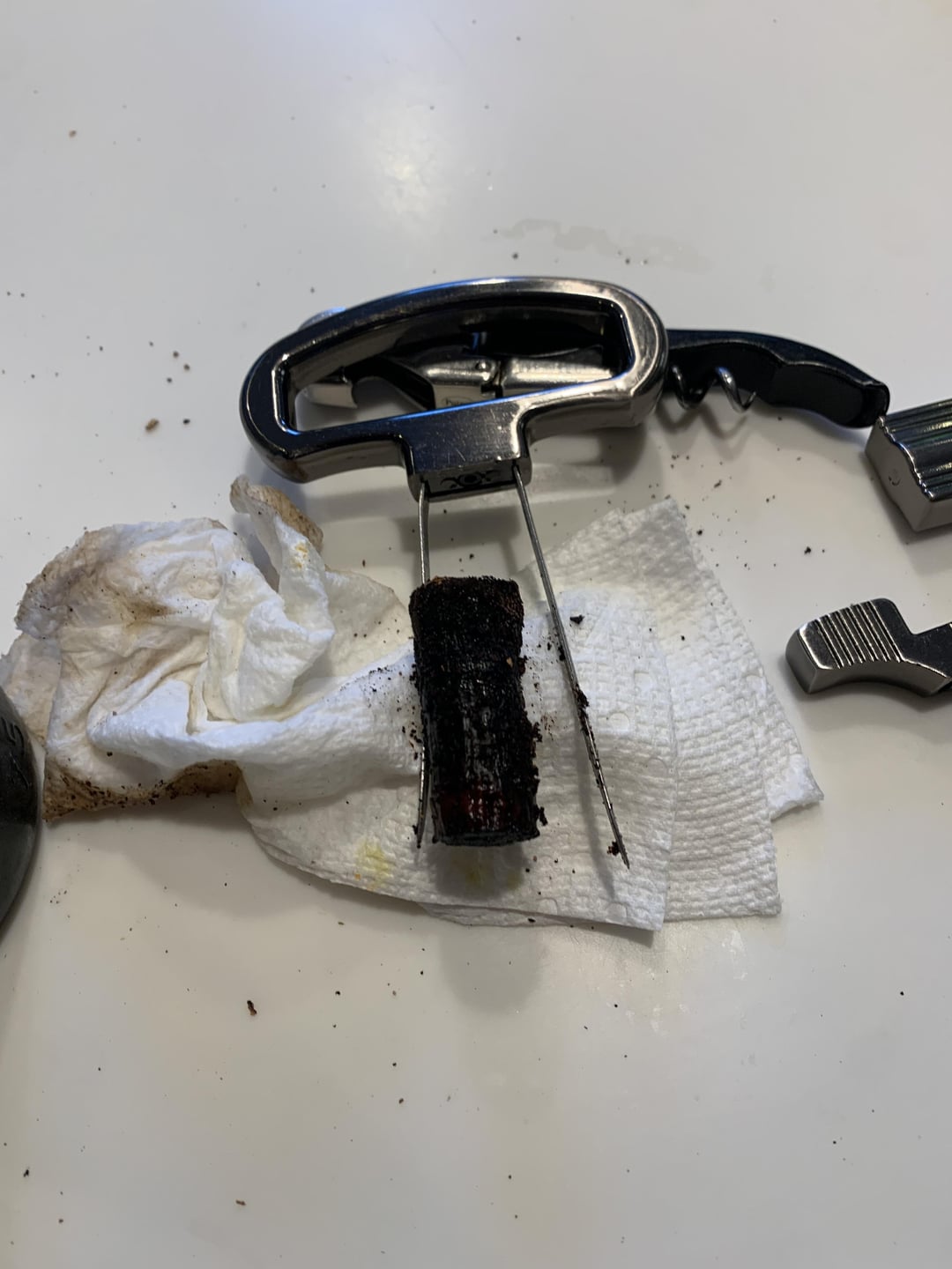 Well, that didn’t go particularly well. Not surprising that it was oxidized. I got the capsule off and went at the cork carefully with the corkscrew part of the Durand. At the slightest touch, the cork started to slide down the neck of the bottle. Changed course and just went with the Ah-so part. Managed to get it out intact but it was clearly not a firm seal.
