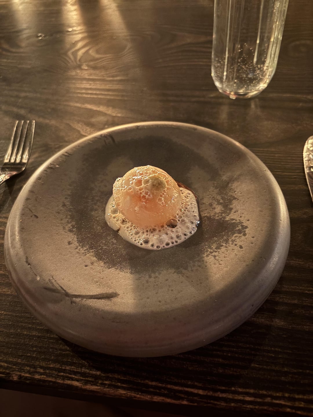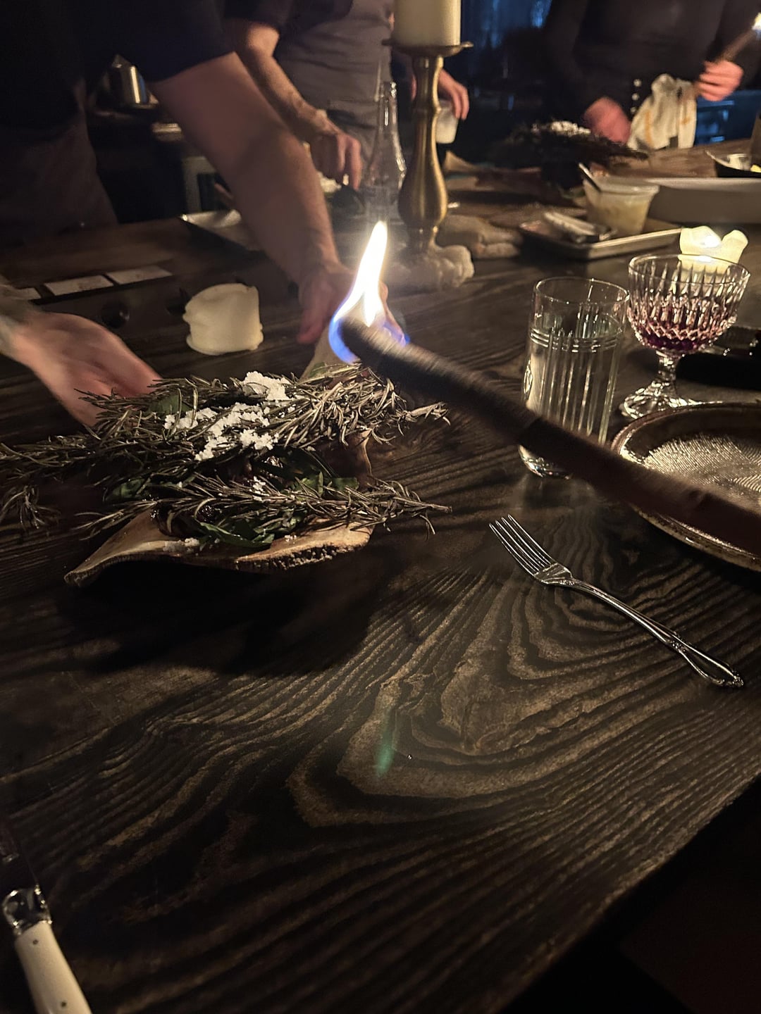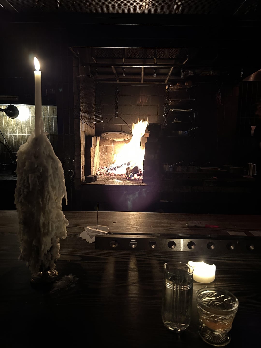 Setting: the restaurant is extremely dark and the music is LOUD. I clocked a few Swans/Michael Gira tracks being blasted at full volume, which makes for an intense and foreboding vibe. The entire place is lit almost entirely by candles and the glow of the live-fire hearth. I was frankly shocked at how well the staff moved around the kitchen given how dark it was in there, as well as how well-choreographed they were at putting out both the tasting menu service and the a la carte dishes for the rest of the restaurant.