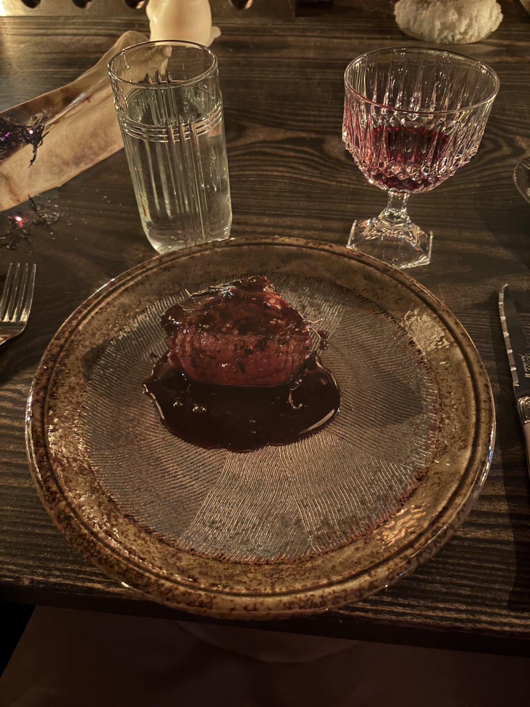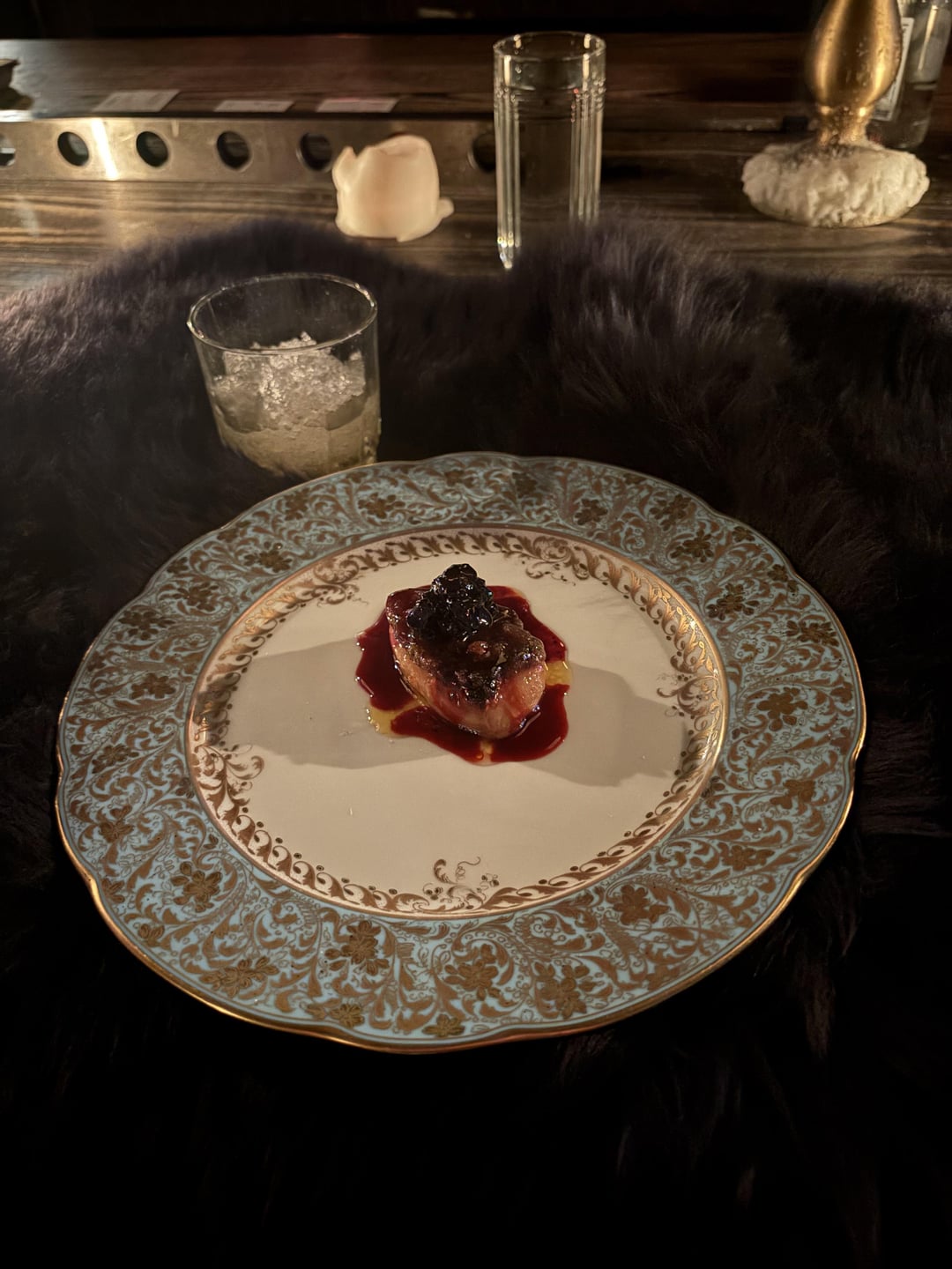 The plates and plating are definitely something….is the foie gras on a fur hide?
