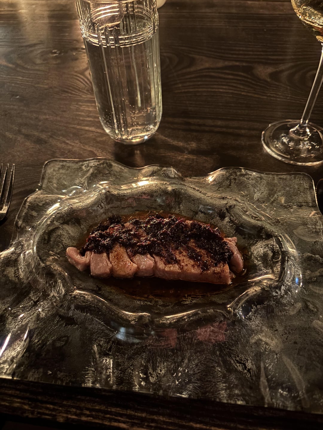 Food: absolutely spectacular. Grant Achatz’s Fire WISHES it was putting out high concept live-fire cooking this delicious and evocative. Highlights were the grilled dry-aged tuna belly with root vegetable XO sauce, wood roasted maitake mushrooms with koji cream (served on a burning log you skewer the mushrooms off of), ribeye with charred beet, a “dessert” of griddled foie gras with burnt blueberries (served with a cocktail of shaved ice, Sauternes and green chartreuse), and the white chocolate ganache with brown butter cookie crumble. Each course kept raising the conceptual stakes and was more delicious than the last.