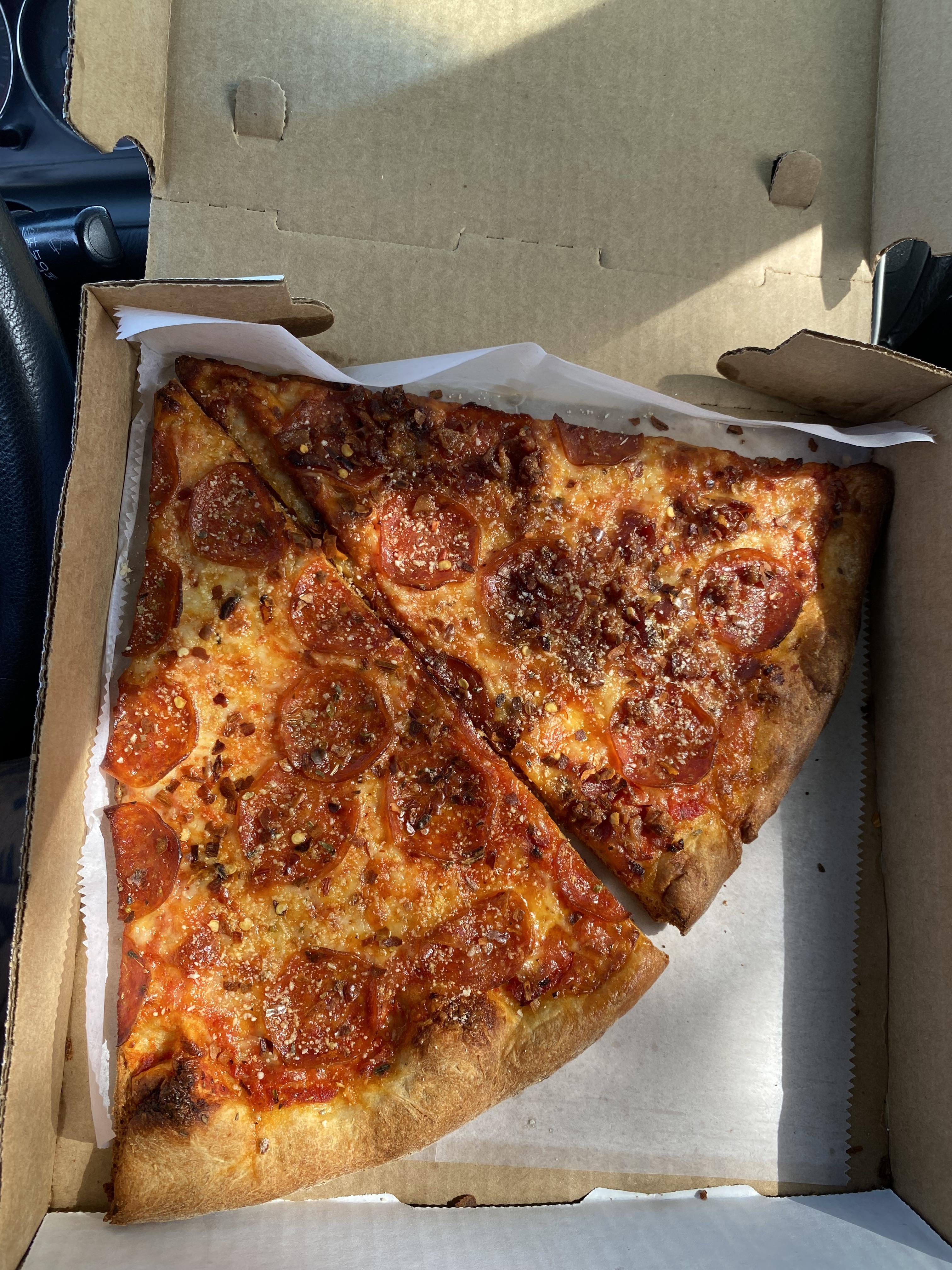 Classic pepperoni & pepperoni/bacon with a lot of crushed red pepper. Well done