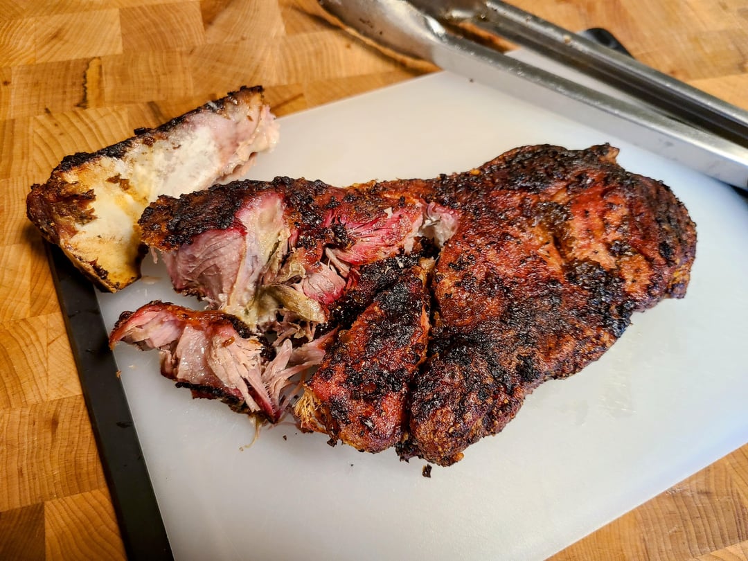 Here's the final result of the direct-heat pork steak. The internal temps were in the 190s and it had a beautiful bark on the outside. I let it rest for 30 minutes. The bone came right out and I cut slices for serving. It's absolutely phenomenal with a mop sauce. The outside tastes like bacon and the inside has the texture of pulled pork.