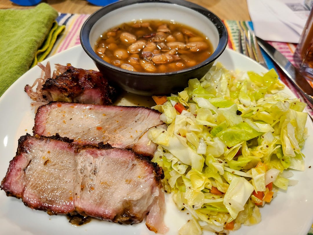 I made some beans (with some pulled pork from the freezer) and some sweet and sour slaw. For a sauce, I made a hot vinegar sauce.