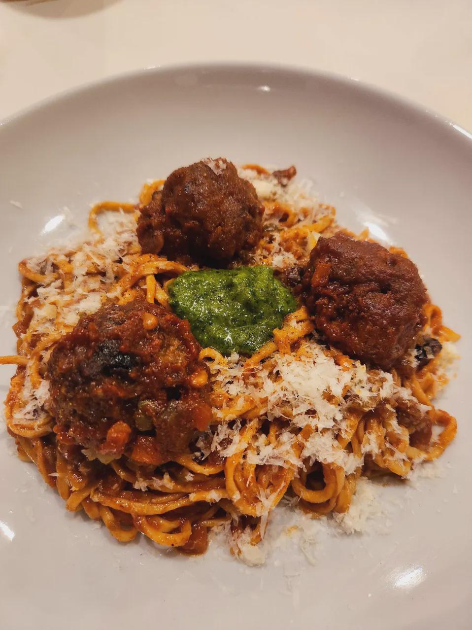 The meatballs are 50/50 ground pork and beef, mixed with breadcrumb, milk, squash miso, raisins and roasted pinenuts