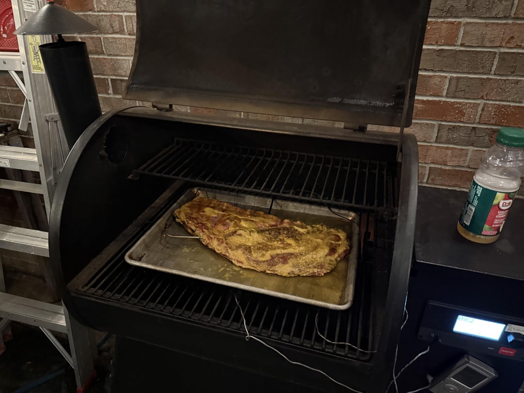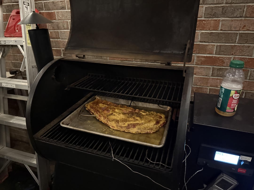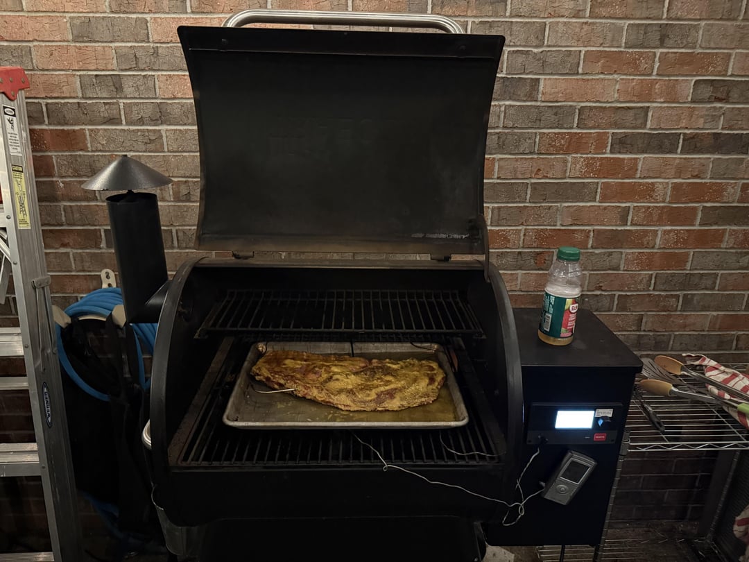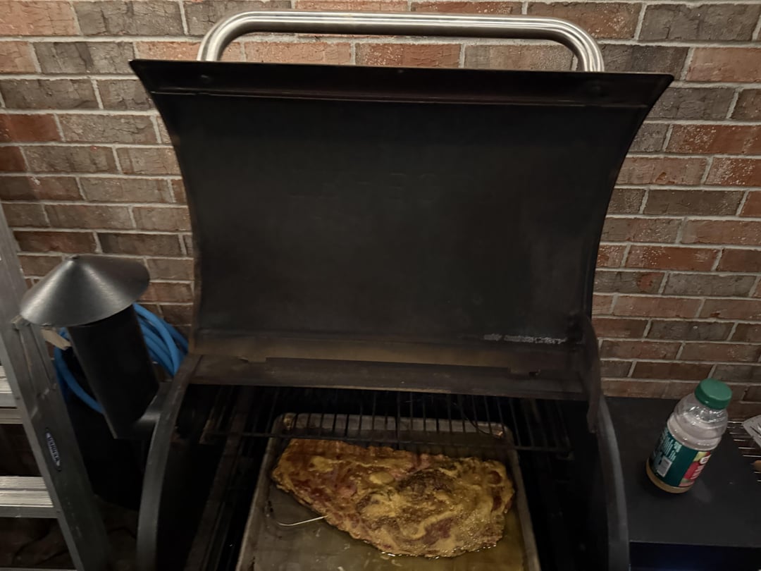 Sheet underneath the grill rack it’s on if you want but not needed. The apple juice is just a spritzer if it’s cracking and getting a bit dry. Apple sauce screwed up the cook.