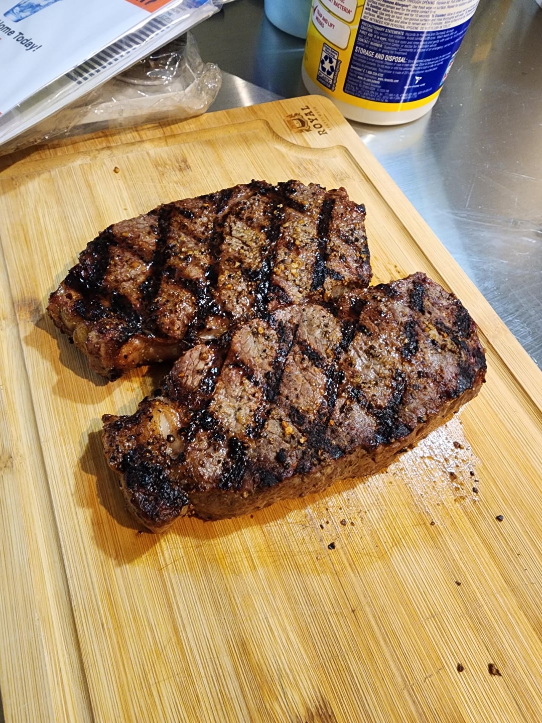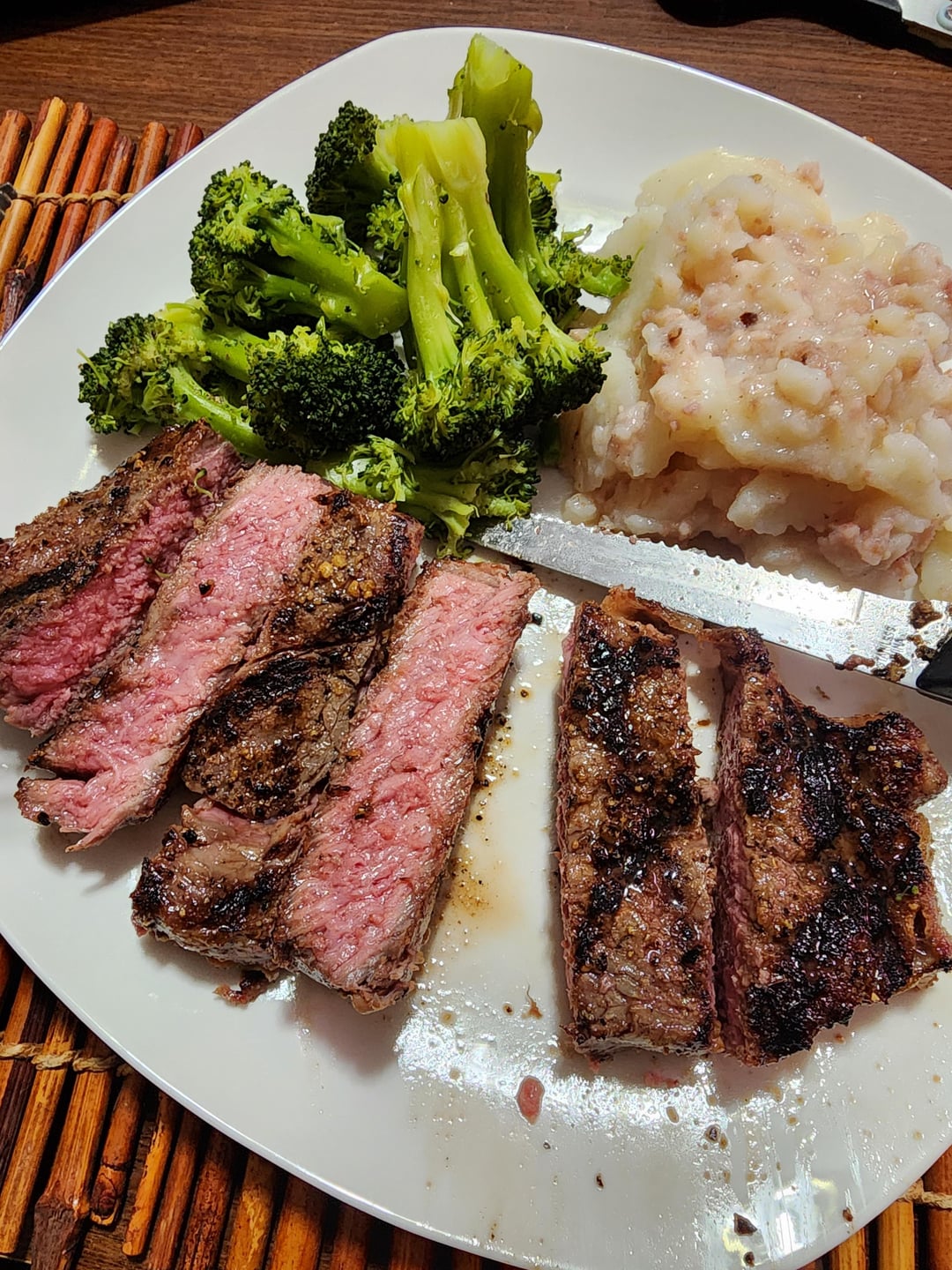 That looks good! Perfect medium rare! For me, medium rare is the best for strip steaks.