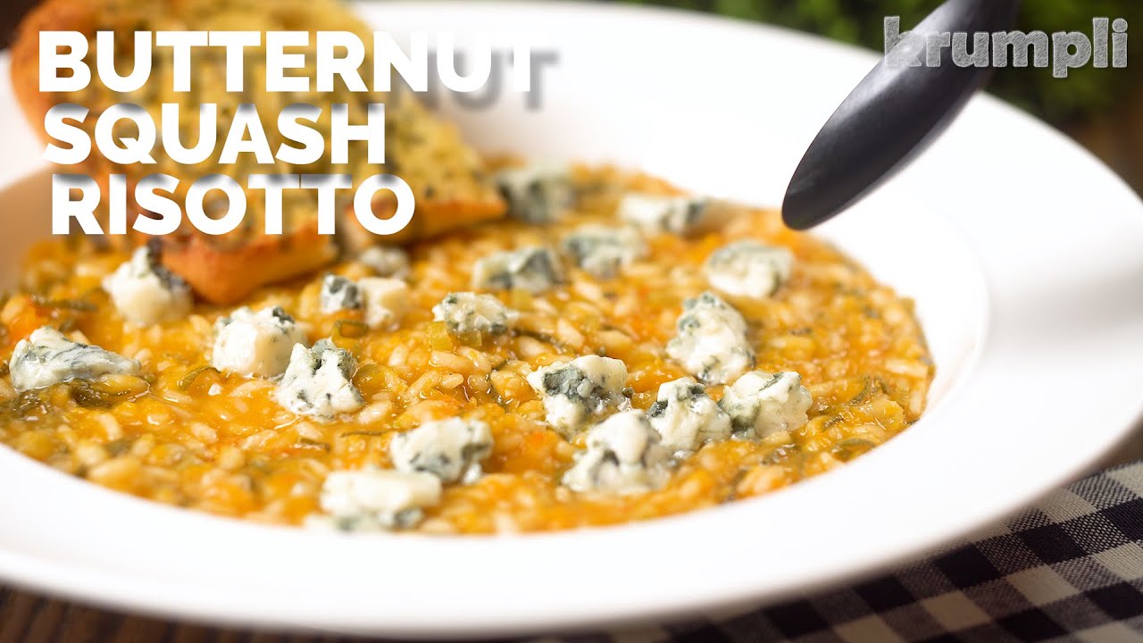 Roasted butternut squash risotto with sage that’s cooked in the classic way resulting in a rich and creamy meal that I top with blue cheese.