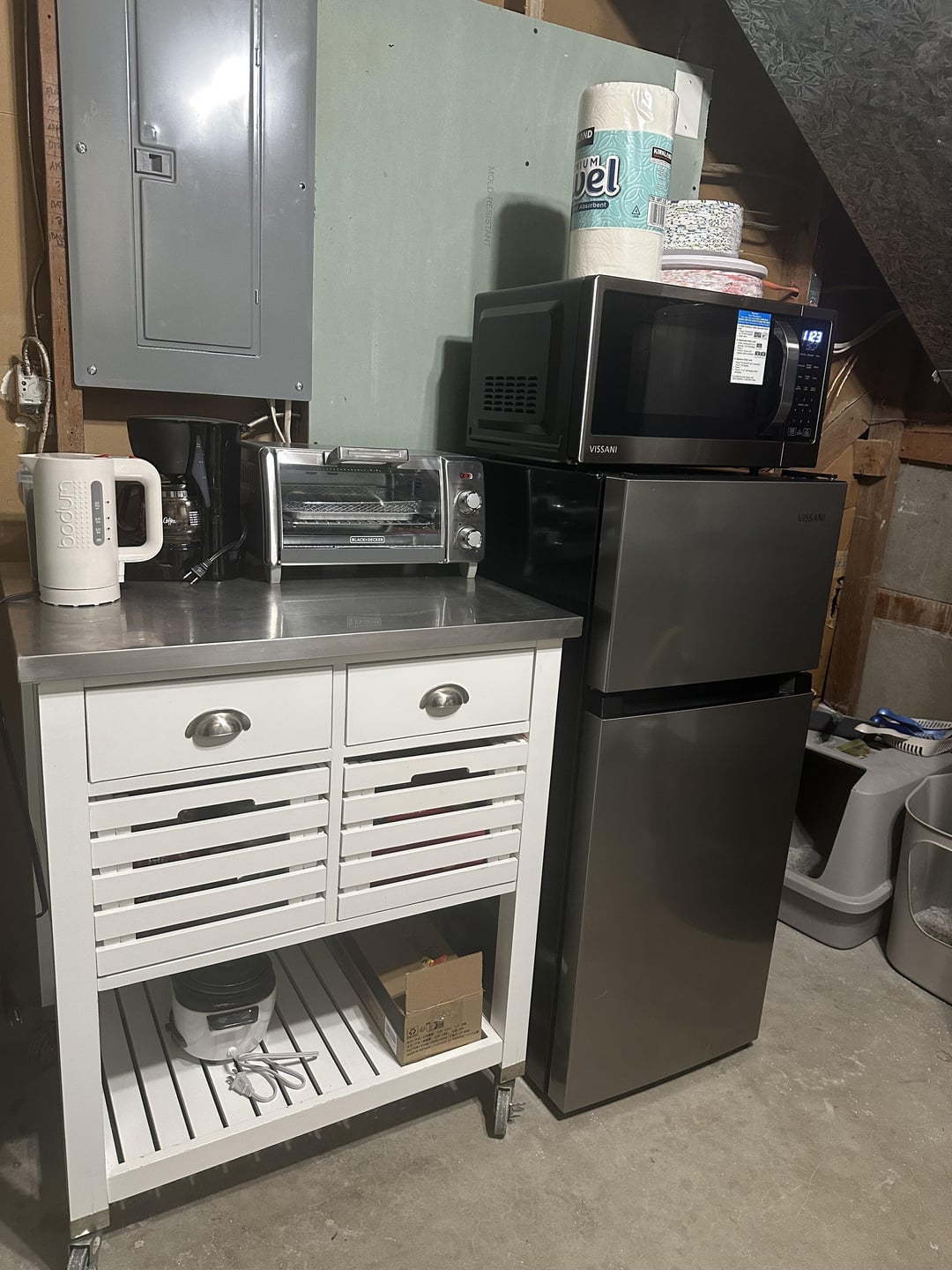 Convenience is key so he can mostly microwave his meals. Don’t worry, I had a licensed electrician, install two dedicated outlets for the refrigerator and microwave.