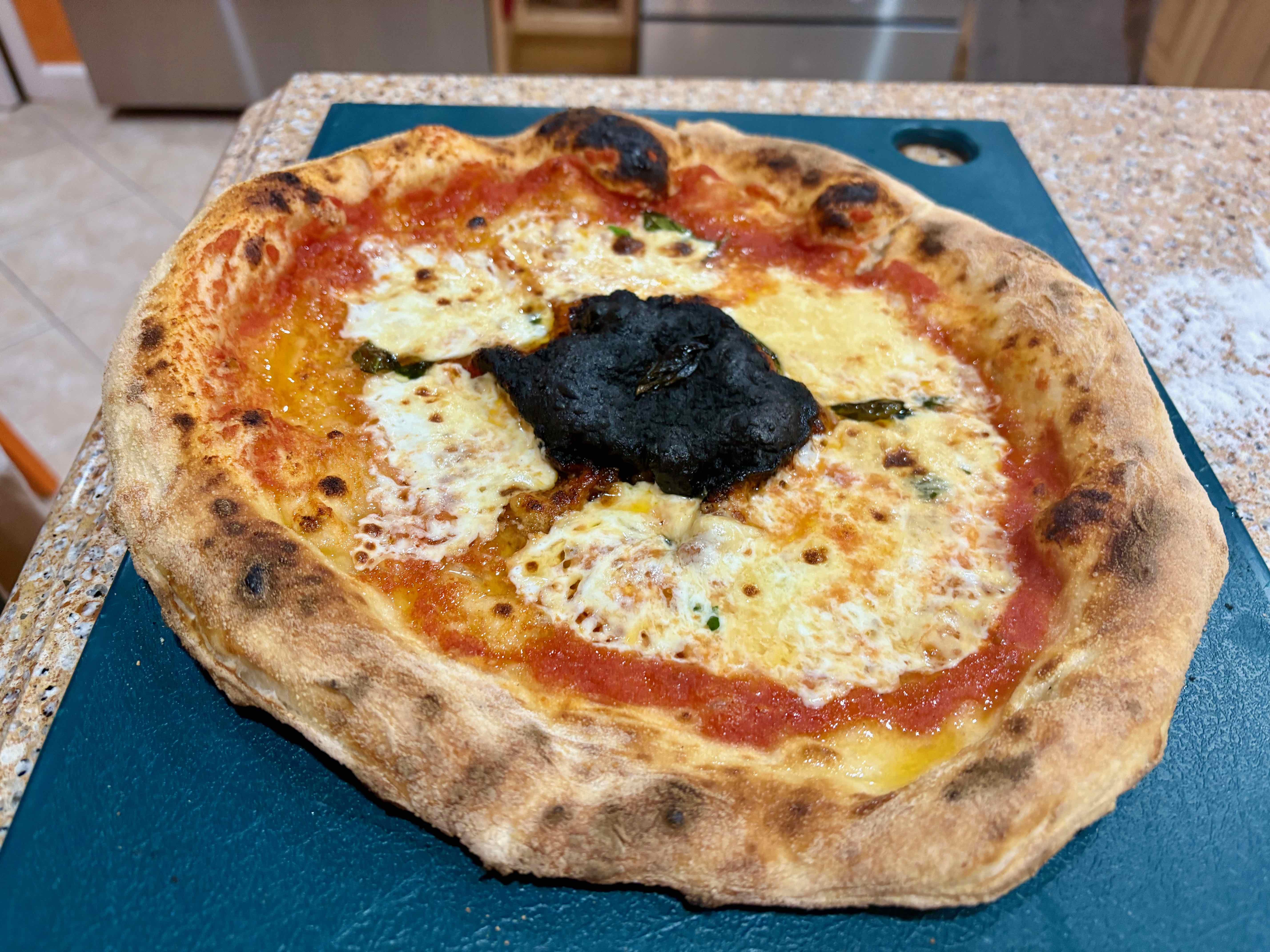 A lil over cooked: it’s meant to be in the oven at 450° for 60 to 90 sec, maybe wrong type of cheese: it seems to have melted e Lil burned so it’s no proper fiordilatte,