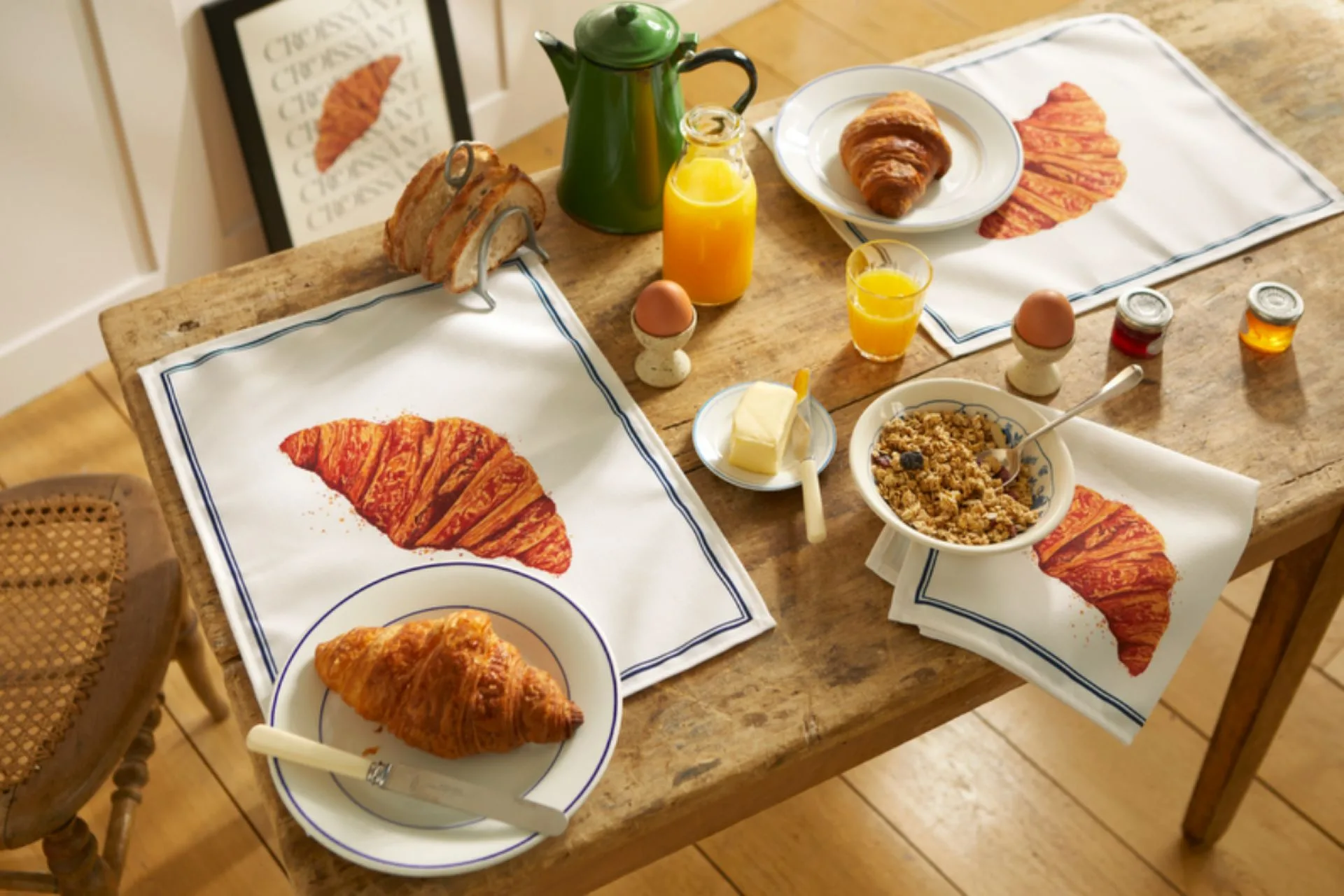 Napkins & Placemats (£24.95 – £34.95) – adorned with croissants or seasonal vegetables