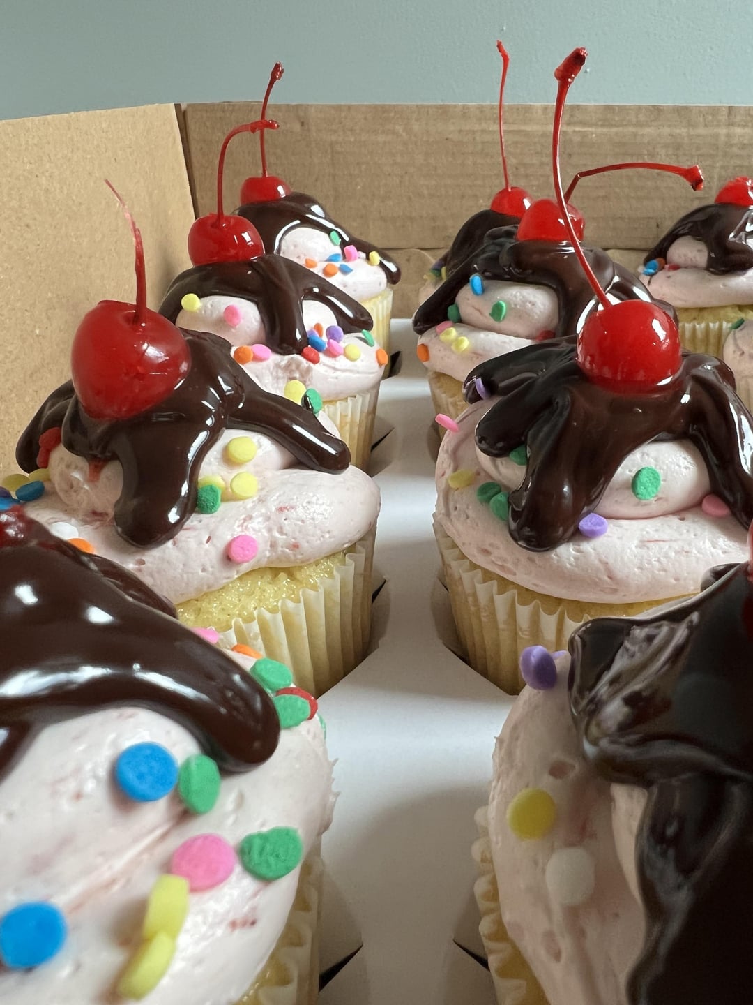 I was inspired to make these after a video I had seen awhile ago. These have vanilla cake, strawberry puree buttercream, chocolate ganache “fudge”, confetti sprinkles and cherries!