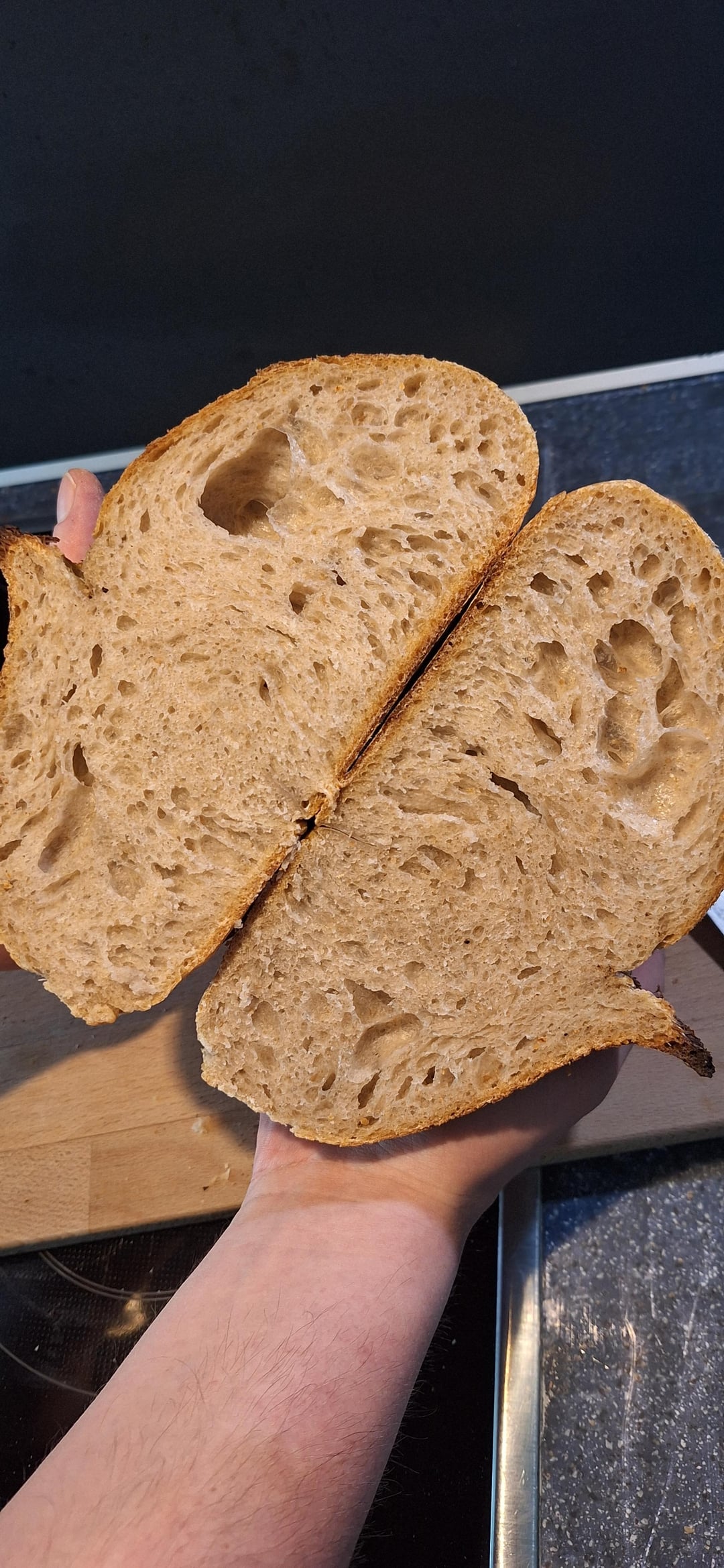 That looks like a solid loaf! Good amount of bubbles and a tall rise! 10/10!!