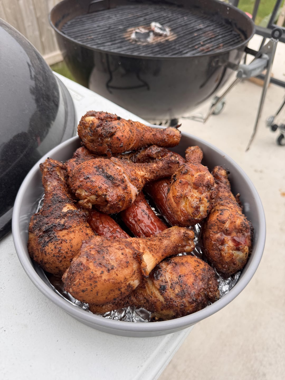 I wanted to make some fajitas but forgot to take them out the freezer. Noticed when I got home all excitedđź’€had some chicken so that when on the grill with the vortex. Used some cluckalicuous seasoning and smoked some southside market sausages too. Fajitas are thawing out for tomorrow.