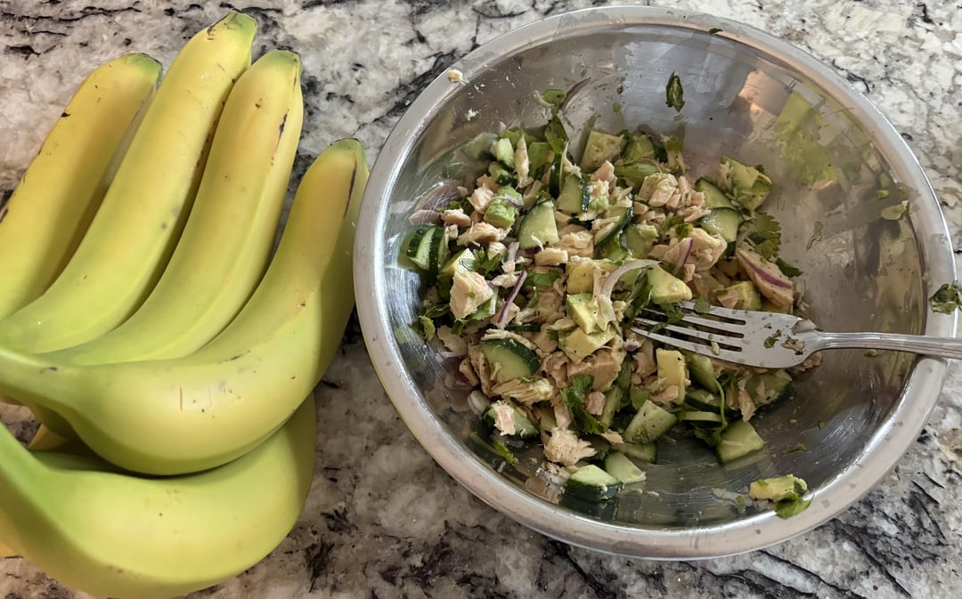 My first contribution here but this is too good not to share. It’s one of the very few meals that doesn’t leave me struggling with hunger. Quick and easy to make, basically chop and mix all the ingredients, add salt, pepper, and fresh squeezed lemon juice to taste and enjoy. Makes a really large portion – I included a bunch of bananas for scale in the second photo. 350 calories, 44 grams of protein.