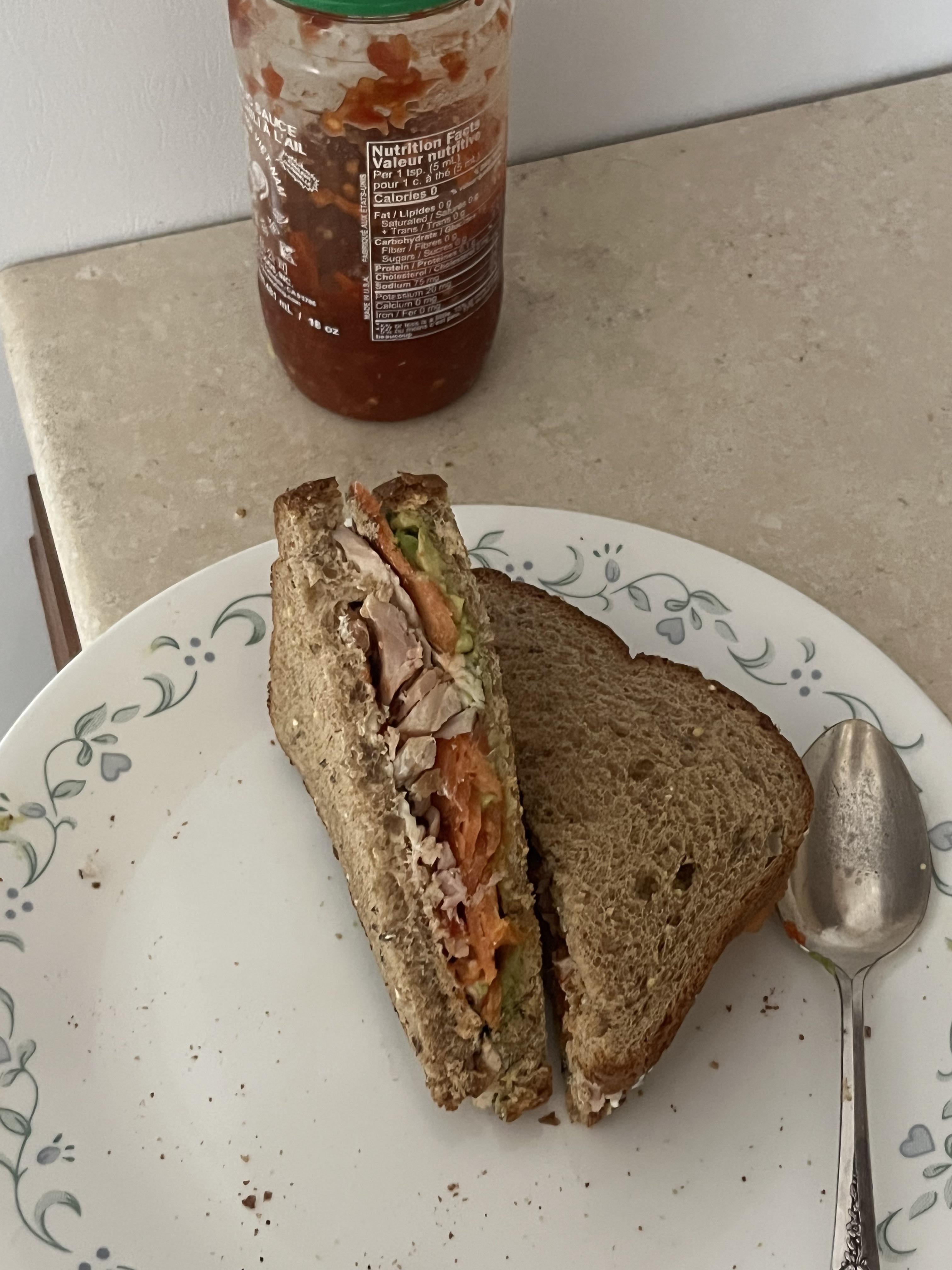 Smoked salmon, chicken, avocado, and cream cheese sandwich with chili garlic sauce