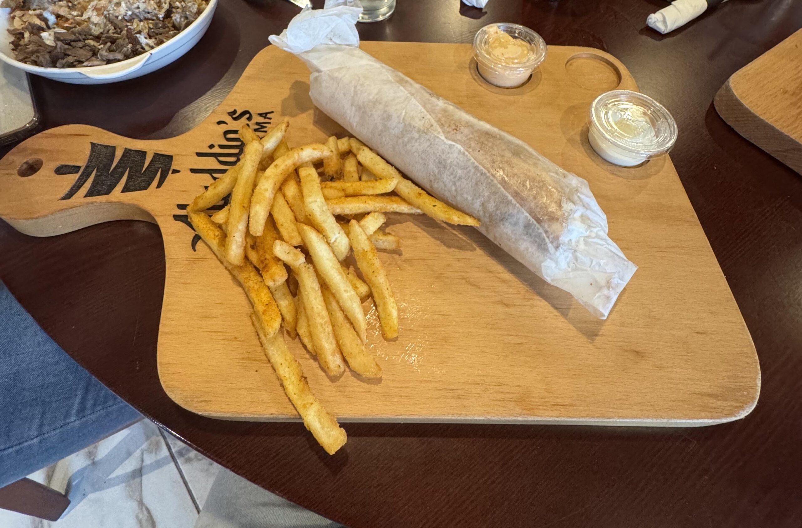 The level of effort they went to — cutting out sections for the sauces, burning their name into the wood — in order to provide a shitty eating surface is really astounding here.