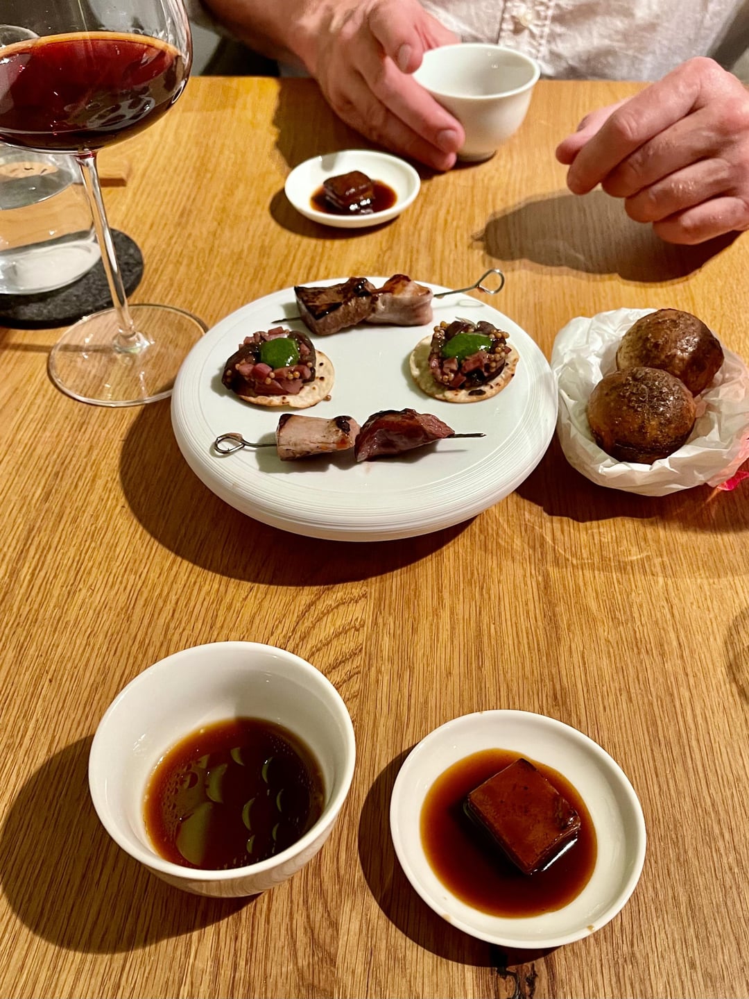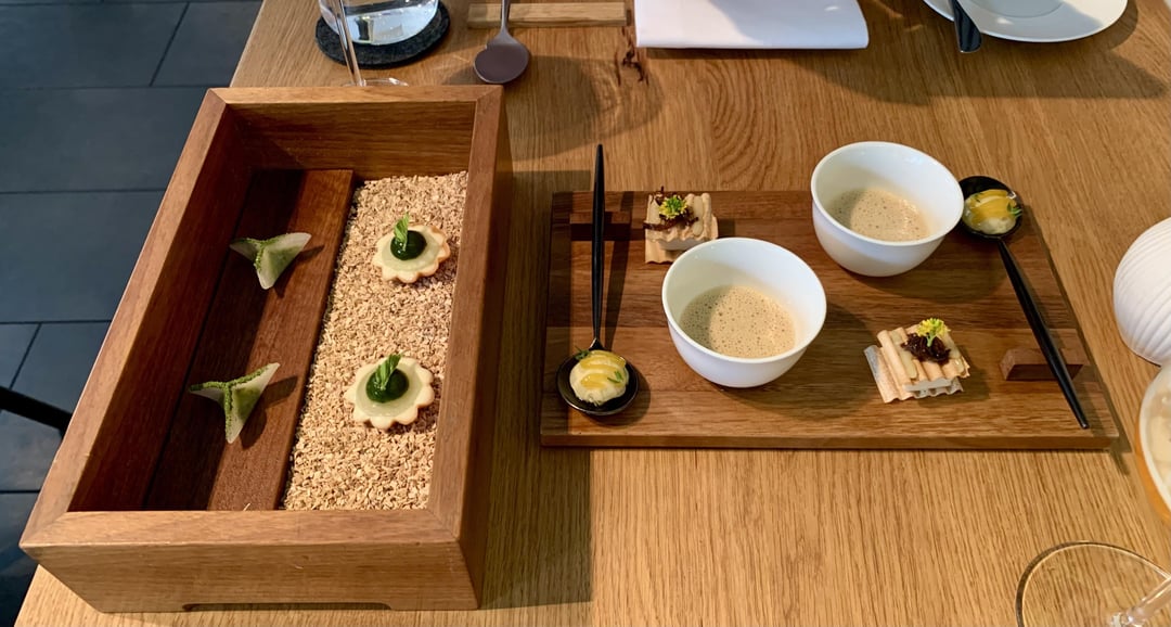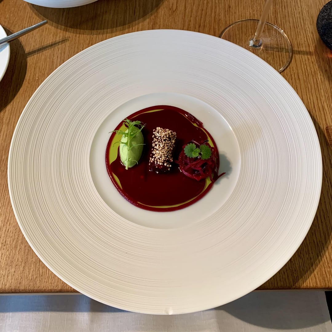 This was my first time having dined in a one Michelin star restaurant. I was having a great experience! The first bites ahead of the first courses presented cabbage turnip in various ways with great focus on bringing out strong and savoury umami-flavours of it. – My favourite of it had to either be strong flavoured, delicious soup of cabbage turnip alongside the crisp with a fine mousse and smoked elements of cabbage turnip. This was followed by a delicious dish of tarragon hollandaise, Safran foam, dill and marinated fennel, just to name the most prominent ingredients. The bread course was straight forward with a nice rustic loaf of bread and some savoury herbal butter. For the next dish we were presented with different varieties of beetroot and a really exciting, superb „Mizuna mousse“ – fantastic! Following up was the carrot course, incredibly savoury and an utter explosion of carrot – literally the platonic essence of a carrot. This dish paired really well with a nicely aged Riesling and its acidity. The next course consisted of white asparagus with a beautiful texture, some crunch, a cream of hemp and some lardo – super interesting and utterly delicious. Up next was a fish dish of pickled char with an intensely smoked sauce and a fantastic and uplifting, really clean char tatar with an onion ceviche and fried buckwheat – nice textures. As for the next course we enjoyed a menu extension „The lamb – celebrated“: skewers of lamb, a lamb taco, a fragrant broth of lamb with mint oil, lamb belly, glazed jus and brioche of lamb shoulder – absolutely stunning and savoury all the way, but never too heavy or overpowering. This was was served with a German Frühburgunder, a genetically related grape variety Pinot Noir – lovely. Next: Lamb – again. But we didn’t mind, it was just too good: A delicate lamb flavour, very nicely grilled, beautifully pink. It was accompanied by a lamb jus, parsley jus, lemon zests and a varnish of apple and celeriac plus an onion reduction. Again, intense and hearty but also uplifting. The pre-dessert was made up of a sorrel sorbet, a vanilla-vinegar gel, and espuma of elderflower, kumquats and a ragout of mirepoix (?) – very acidic, but also very refreshing after the savoury lamb dishes – nice! The dessert revolved around rhubarb – a sorbet, a sauce, a ragout, a gel etc. for me, it was just a little bit too acidic and I had wished for something a little sweeter. Luckily, it was accompanied by some sweeter ice cream, some nut brittle, and a vanilla cream. All in all, the dessert wasn’t a disappointment but the weakest course of the menu, for my taste. The Petit Fours, however, were very much to my likings: a parfait of coffee and cardamom, a praline of vanilla and cheesecake, and, last but not least, a wild berry sorbet with parsley oil and rosé champagne.