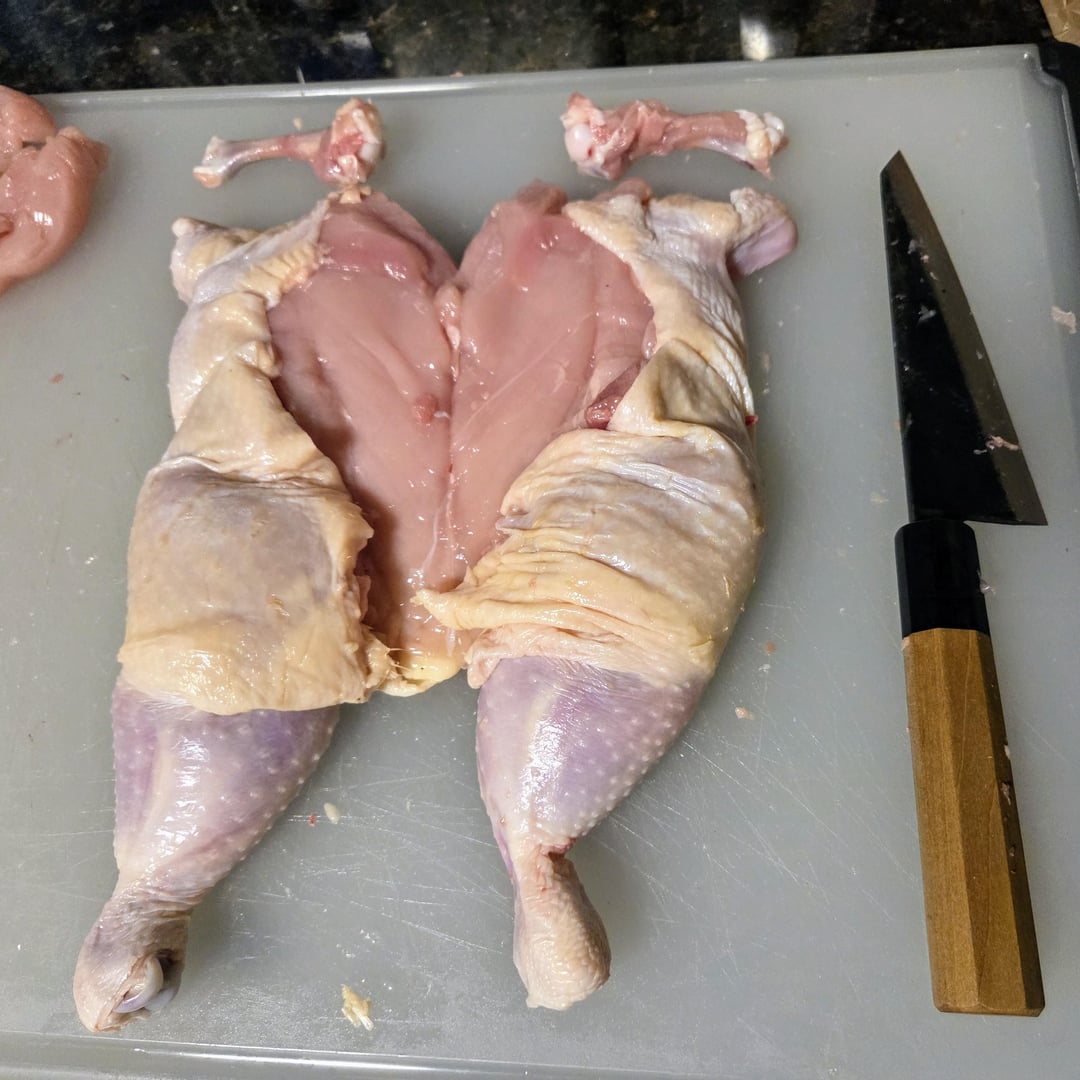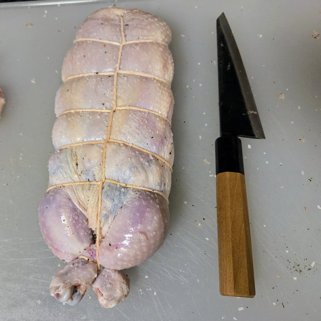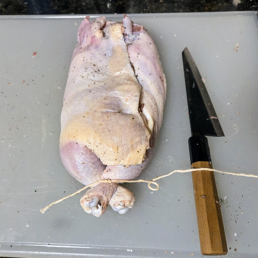 Here are some pics of the steps for deboning a chicken. The final deboned chicken is called a ballotine. It's seasoned with kosher salt, white pepper, and herbs from our garden – parsely, sage, rosemary, and marjoram. I'm going to grill this over charcoal and wood chunks tomorrow along with homemade sourdough flatbread, grilled onions, sweet peppers, and golden beets. It's going to be delicious!