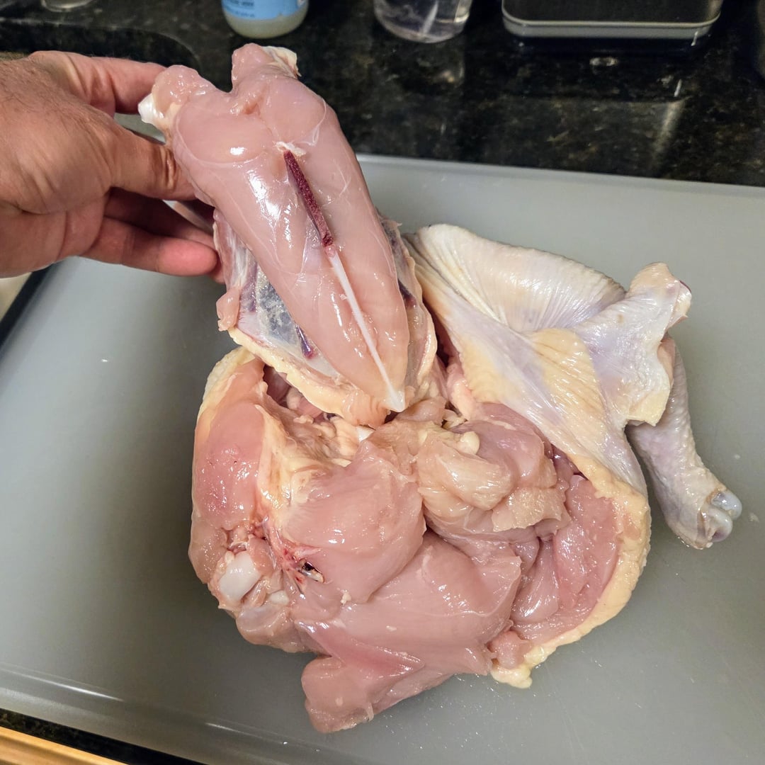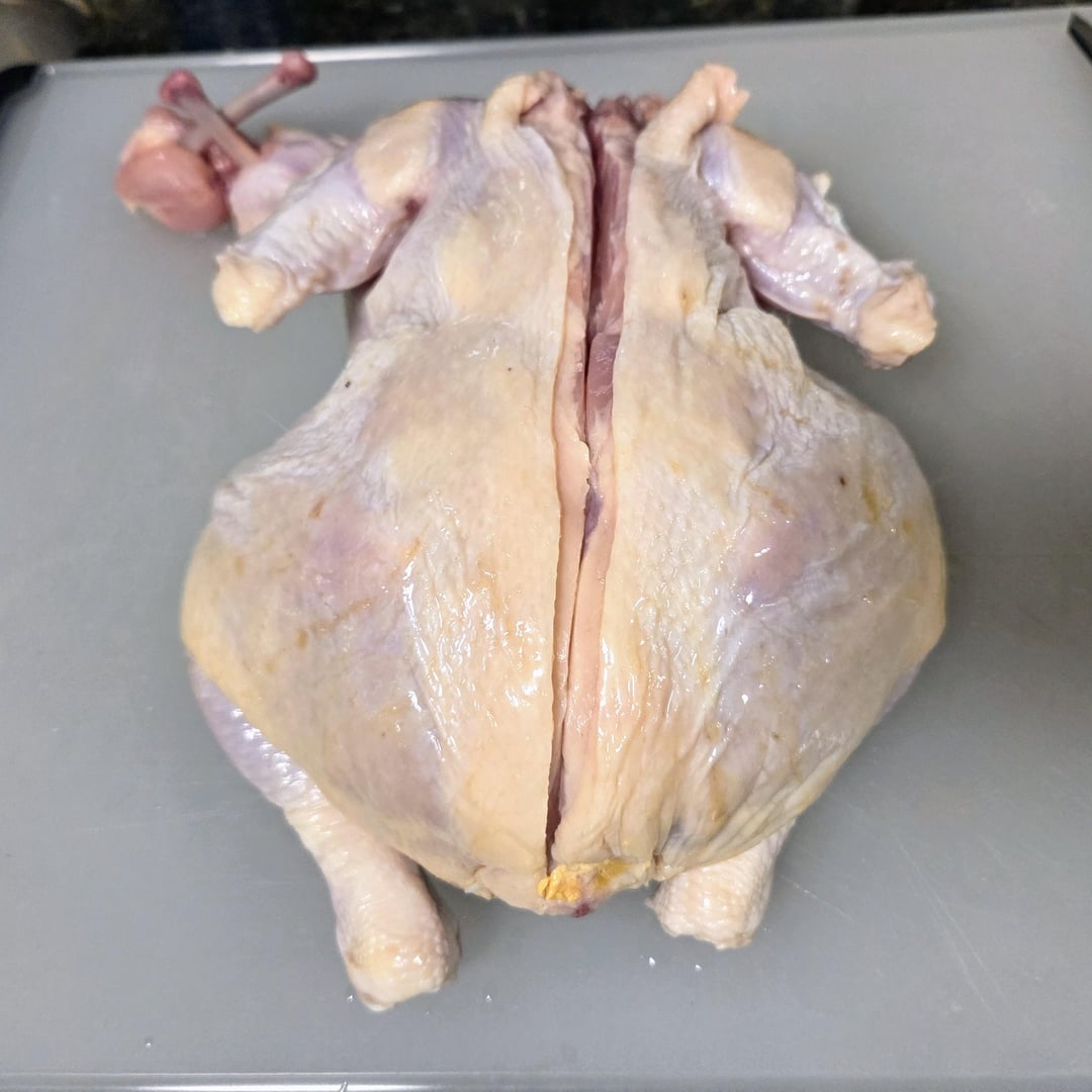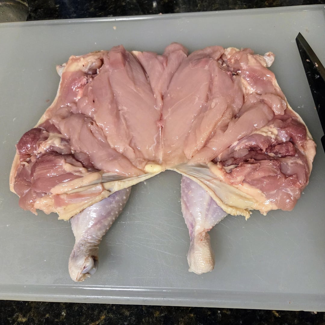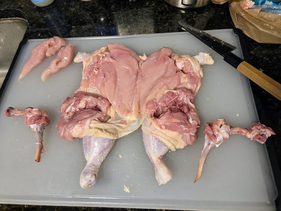 Here are some pics of the steps for deboning a chicken. The final deboned chicken is called a ballotine. It's seasoned with kosher salt, white pepper, and herbs from our garden – parsely, sage, rosemary, and marjoram. I'm going to grill this over charcoal and wood chunks tomorrow along with homemade sourdough flatbread, grilled onions, sweet peppers, and golden beets. It's going to be delicious!