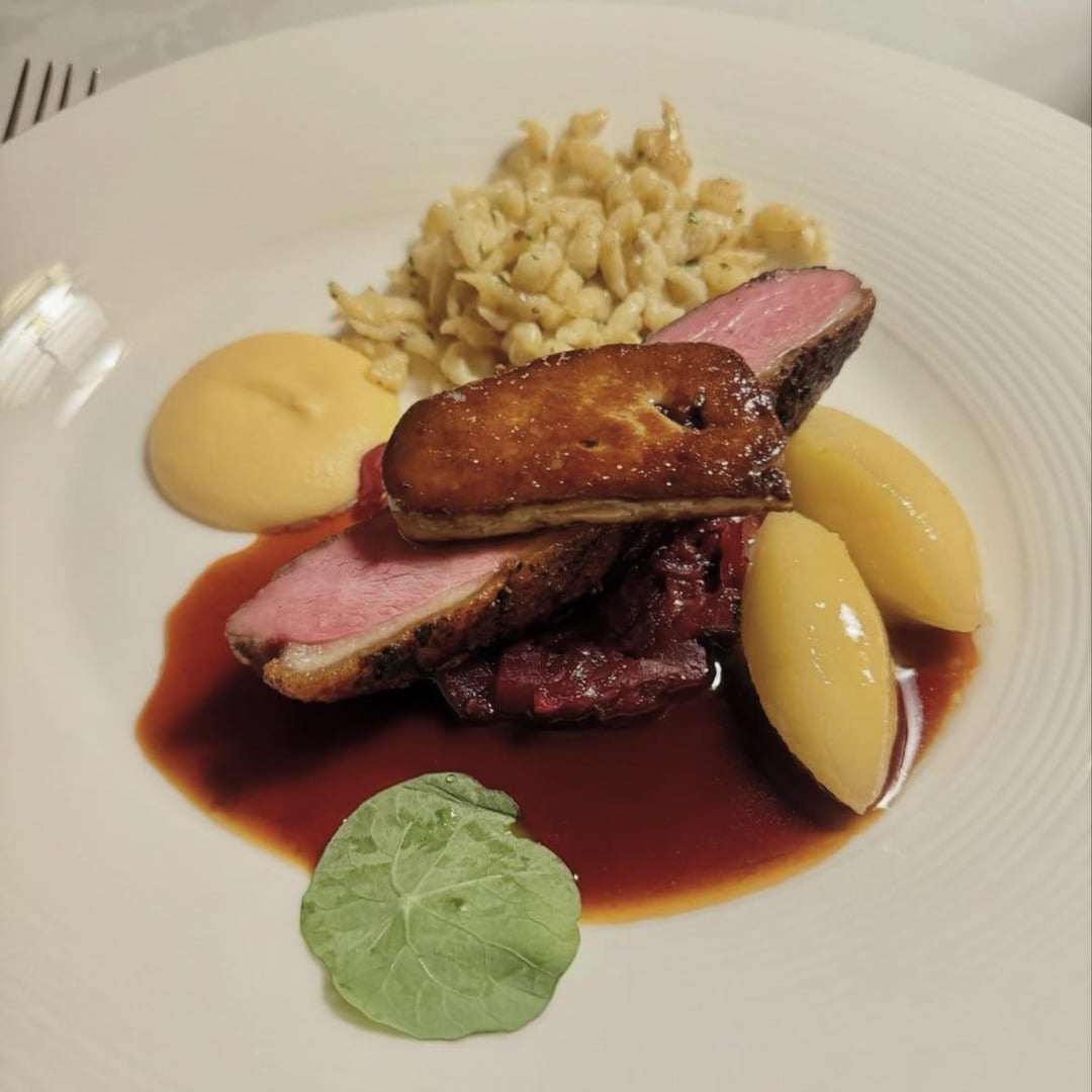 “A Duo of Duck” – (1) Foie Gras & Spätzle (2) Pepper-Crusted with Rhubarb Compoate and Turnips: The duck was perfectly cooked in both servings. The first, with seared foie gras, stock-port wine sauce, and spätzle, was incredible, balanced beautifully by tangy sauerkraut-citrus gel quenelles, though they gave a bit too much. The second serving was just as perfect, with a divine blend of pepper, rhubarb sauce, turnip purée, and onion. I couldn’t get enough of the sauce! 20/20