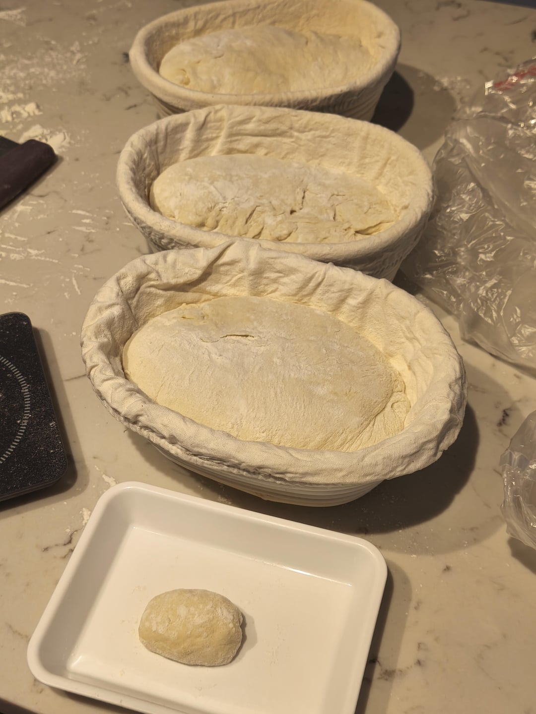 • 45 min – Toss in oven proof setting (100 F) with damp towel over mixing bowl – Dough temp should be measured around 28-30 C
