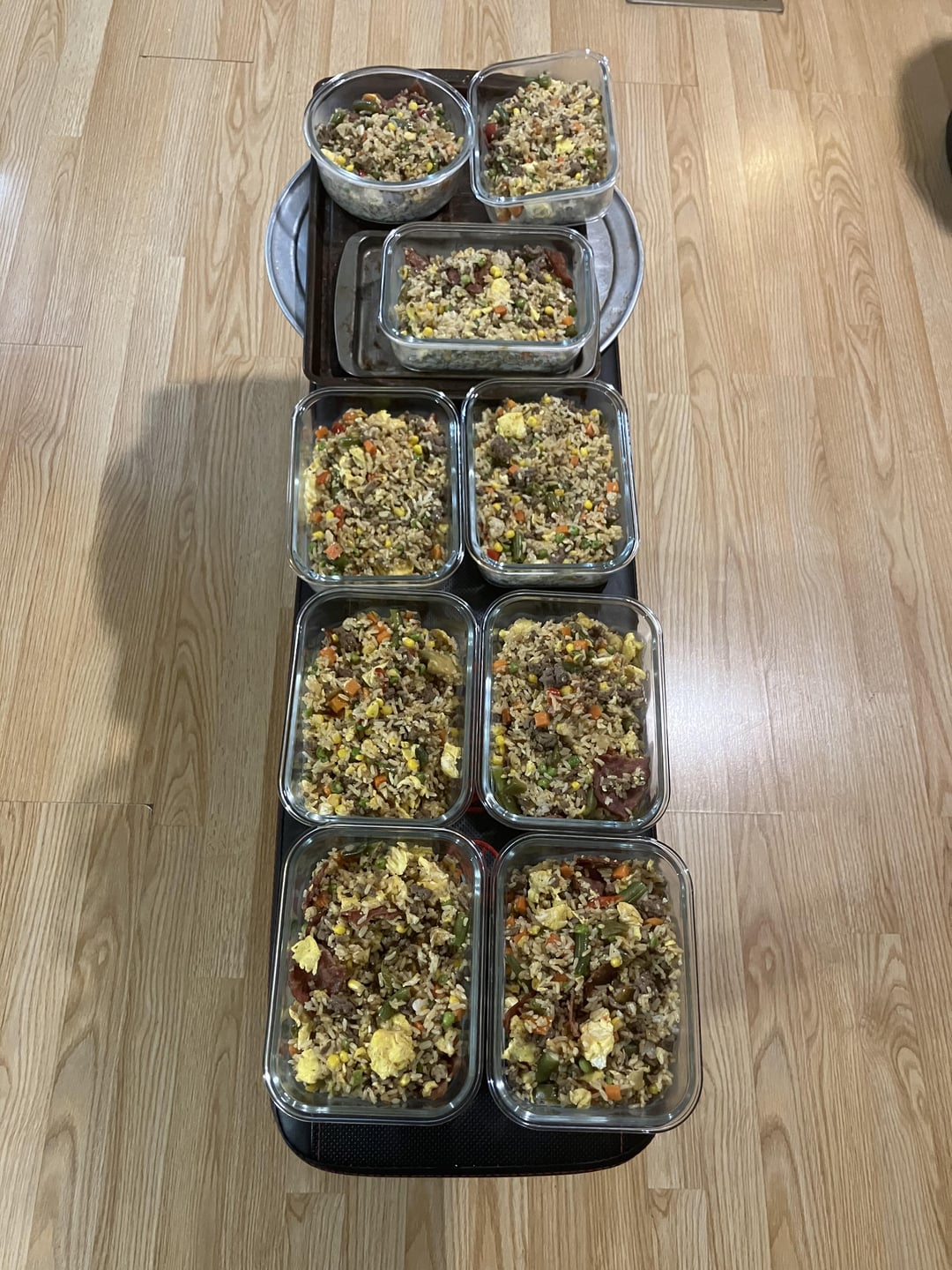 White Rice, Eggs, Lean Ground Beef, Turkey Bacon, Mixed Veggies, Pepper Onion Blend, Oyster Sauce, Toasted Sesame Oil, Low Sodium Soy Sauce, and Crack MSG