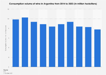 OIV. (2024). Consumption volume of wine in Argentina from 2014 to 2023 (in million hectoliters). Statista. Statista Inc.. Accessed: May 04, 2025. https://www.statista.com/statistics/730738/wine-consumption-in-argentina/