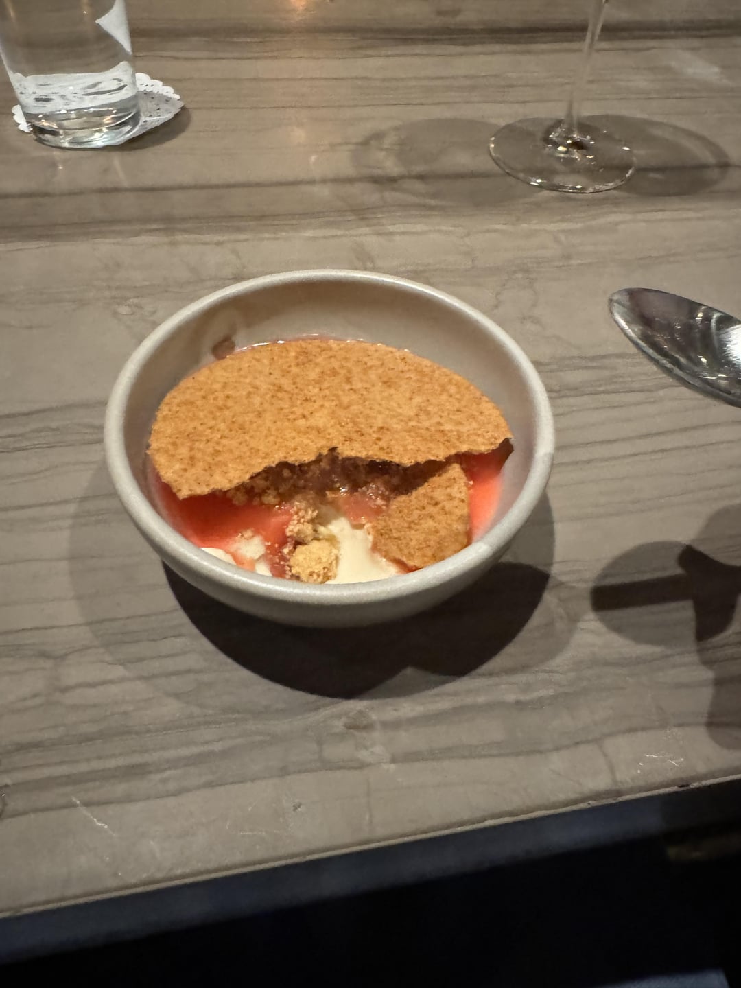 - Dessert: Toasted soy panna cotta with rhubarb and hay. This was very tasty, if not particularly interesting. Overall not a bad end to the meal.