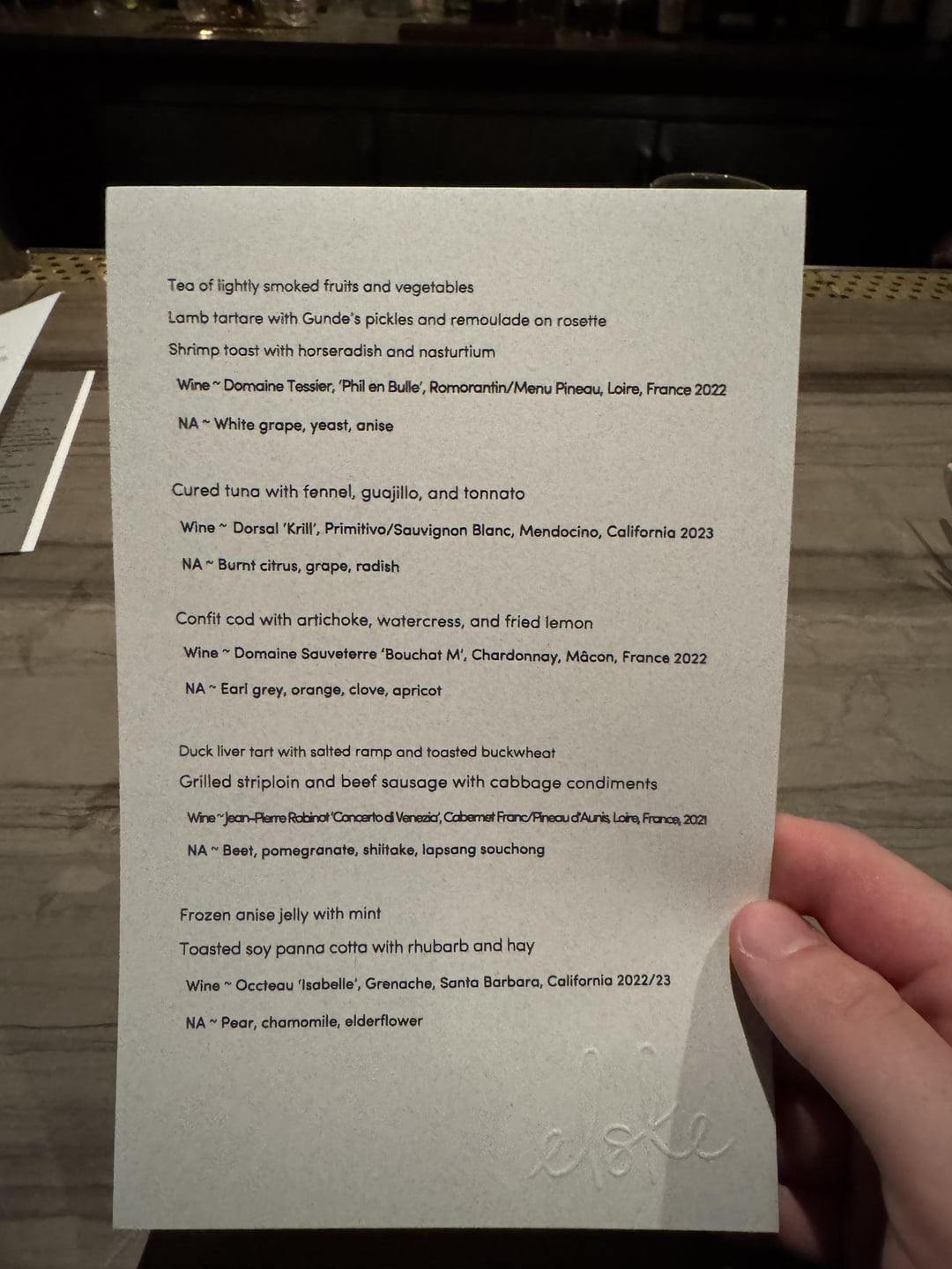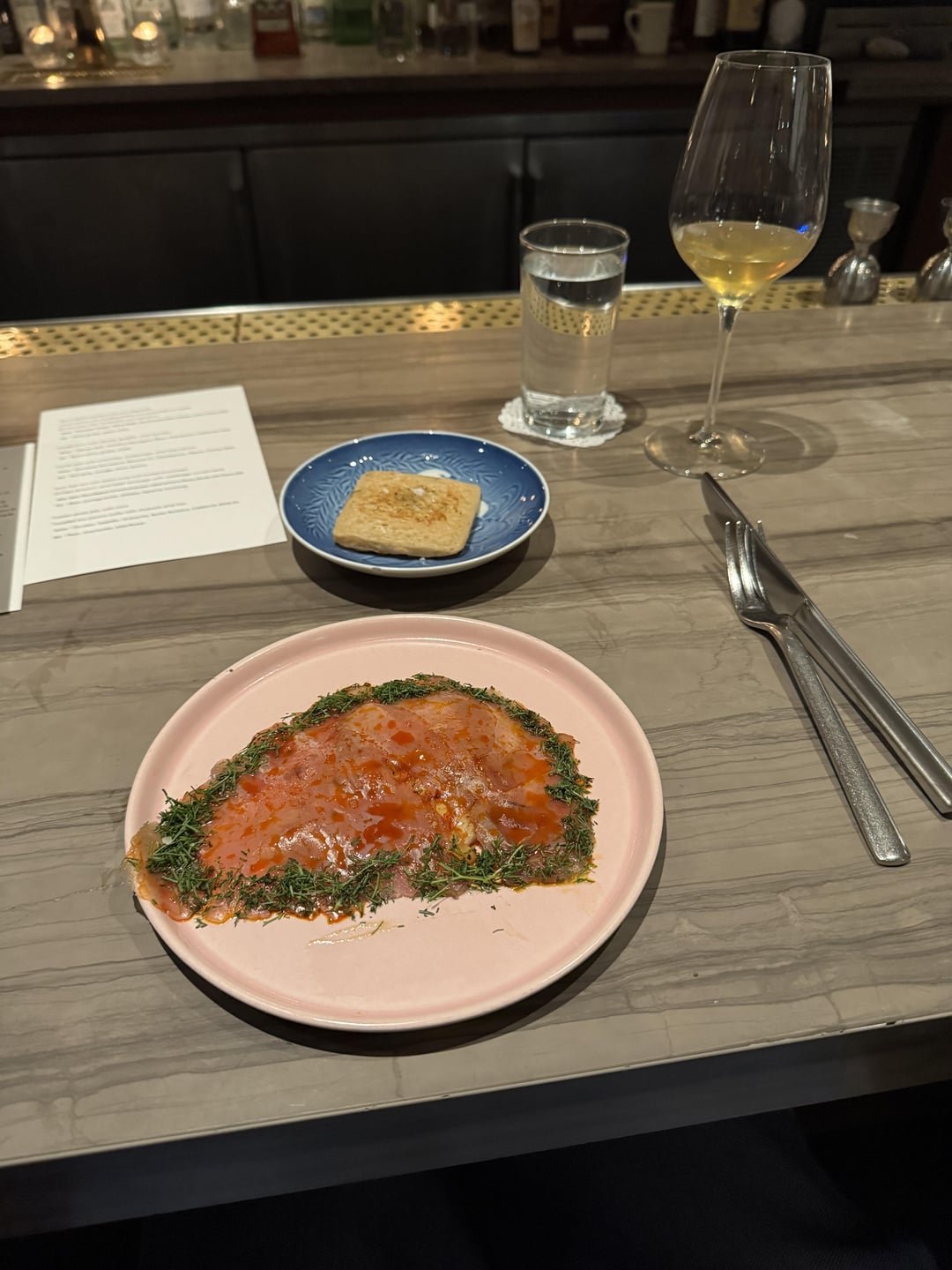 I was walking around Chicago last night and I managed to secure a walk-in seat at the bar at Elske. I ordered their tasting menu ($135) along with the juice pairing ($35) and a cocktail ($16). Elske is a Scandinavian restaurant in the West Loop neighborhood of Chicago. While I am not a regular by any means, this is my fifth or sixth time here in the past several years. It was my second time trying their tasting menu and my first time trying the juice pairing. I have no complaints about the food, but most of the juices in the pairing were a bit sweet for me, even though they were complex and had great depth of flavor.