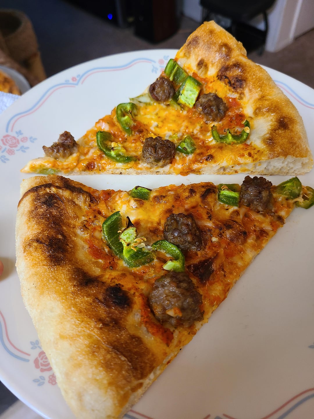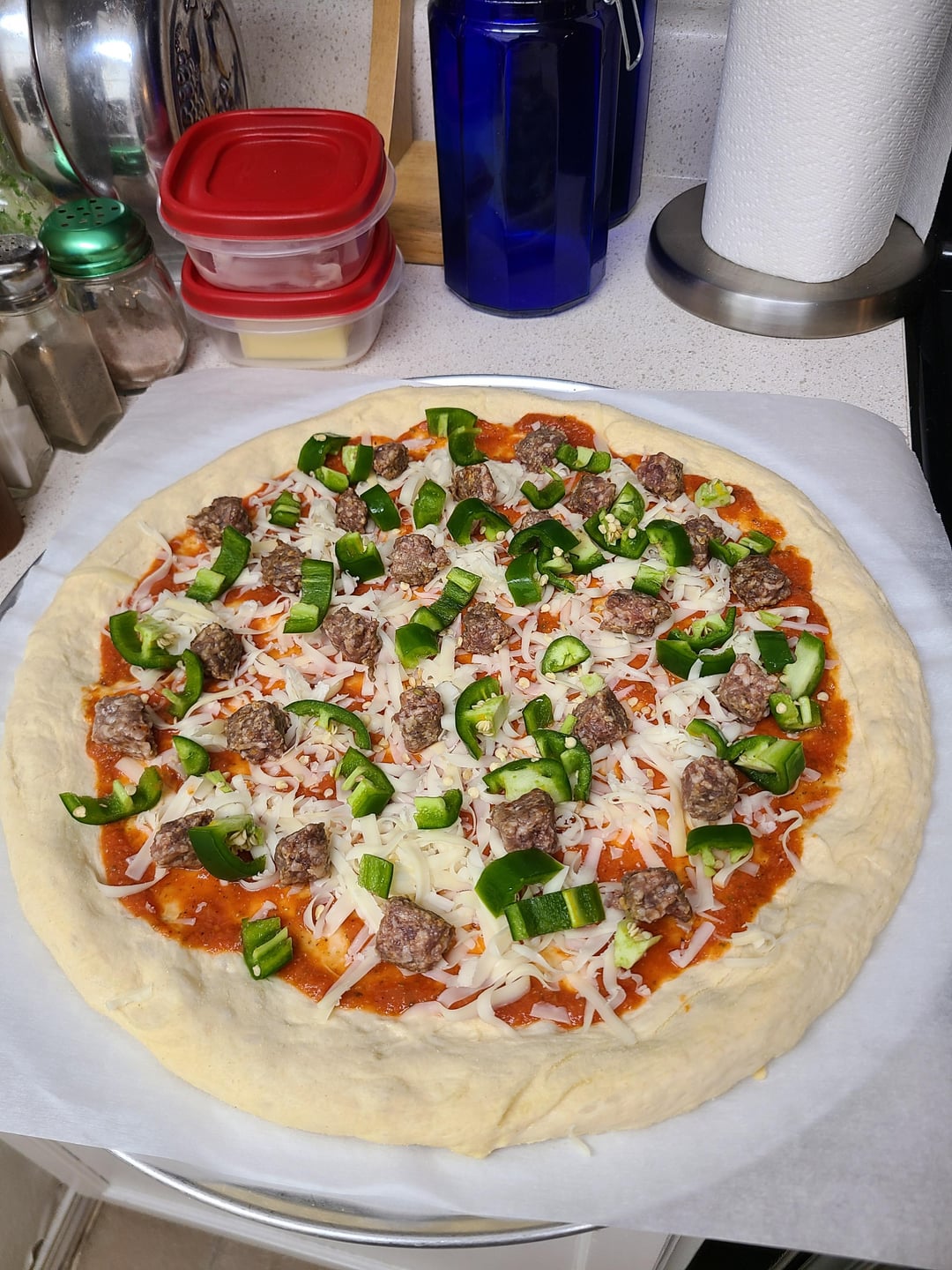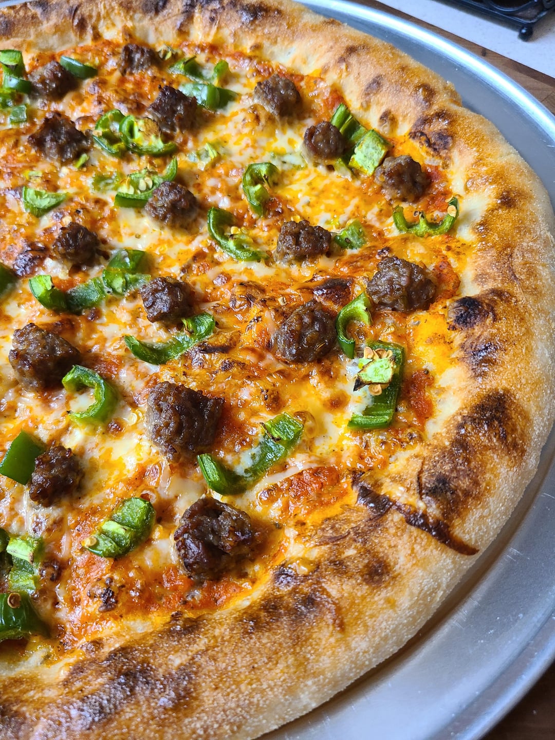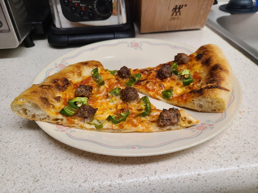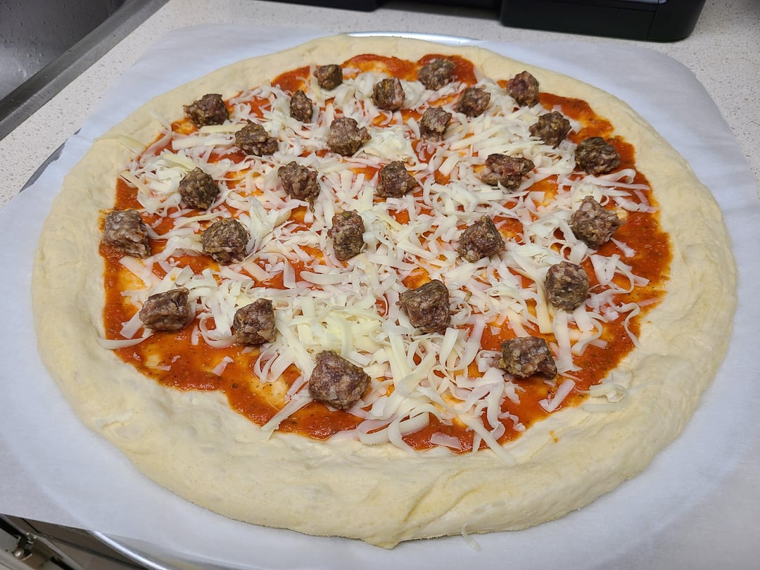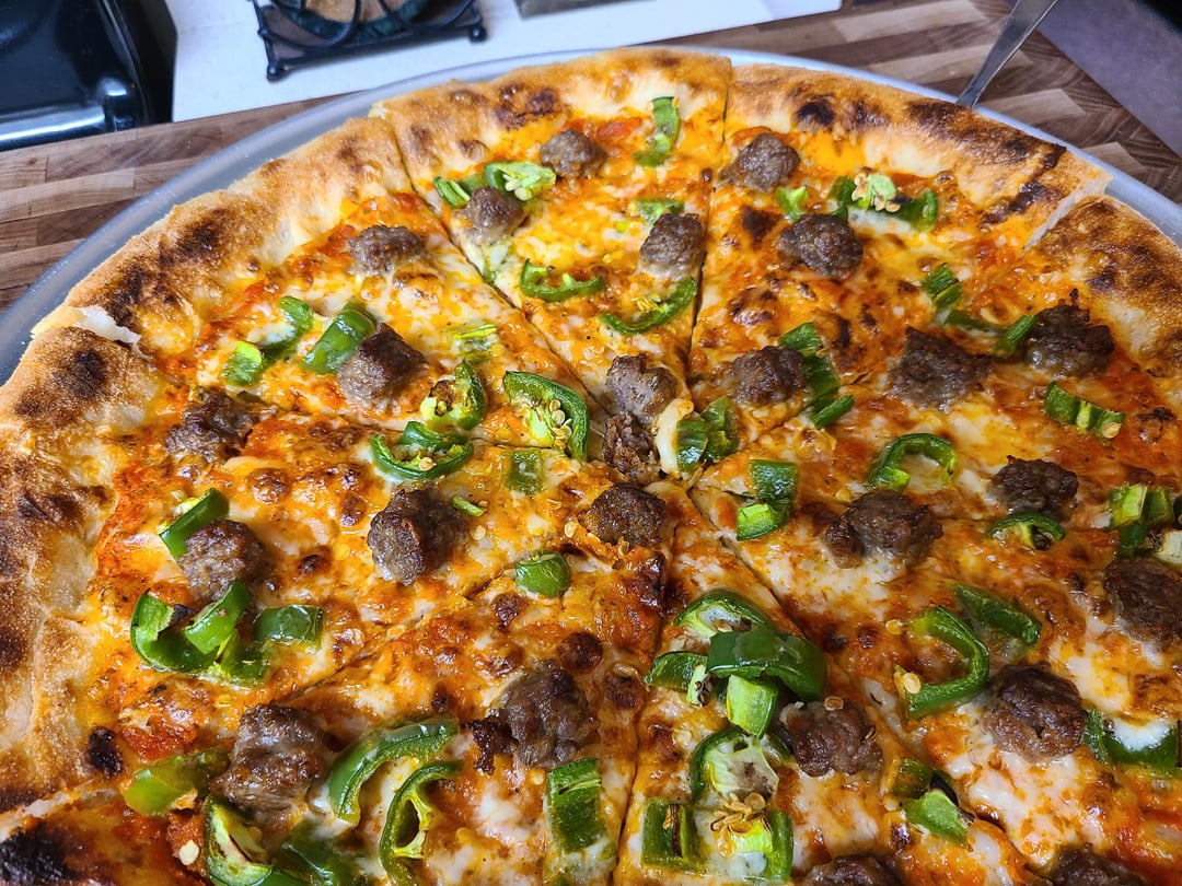 Om nom nom nom! Italian sausage, fresh chopped jalapeños, (my own) tomato sauce, fresh shredded mozz, provolone and smoked Gouda. by bigboxes1 8 Comments bigboxes1 5 months ago Dough and sauce recipes: [https://www.reddit.com/r/Pizza/s/ivnpsqc1R2](https://www.reddit.com/r/Pizza/s/ivnpsqc1R2) thost02 5 months ago Looks yummy bigboxes1 5 months ago Some pics of the dough process.https://preview.redd.it/5zsnm86uprye1.jpeg?width=3024&format=pjpg&auto=webp&s=af61b1a7c8b9b85e09a24e653cab2f521208307fDough has been divided, kneaded, balled, brushed with olive oil and covered with plastic wrap. Let sit on counter for two hours. pauliewalnuts38 5 months ago That looks so delicious! DougieDouger 5 months ago Oh yeah that’s the good shit Mobile_Aioli_6252 5 months ago Beautiful ❤️ gran_matteo 5 months ago Killed it. Awesome work CoupCooksV2 5 months ago That pizza looks sensational, would demolish that whole thing 👌🏻Write A CommentYou must be logged in to post a comment.