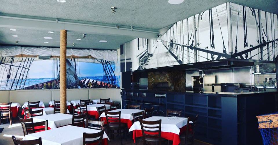 Ostrer purchased the restaurant and redesigned the interior with a surplus of coastal charm, including navy blue accents, rope-wrapped columns, and an ice case for displaying the catch of the day.