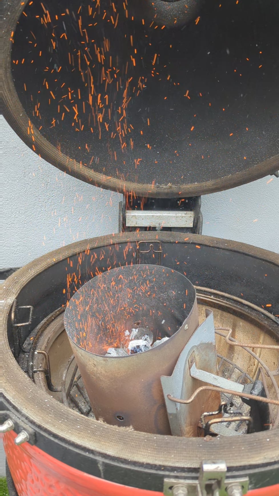 Never seen someone use a chimney in their Kamado before. But I guess if you are in a hurry, it will come up to temp faster this way
