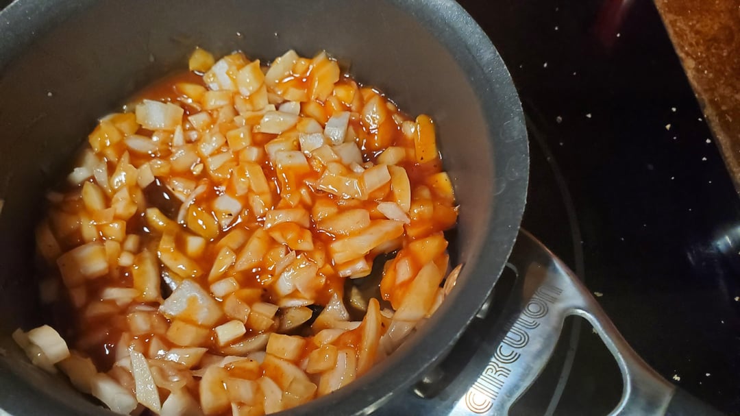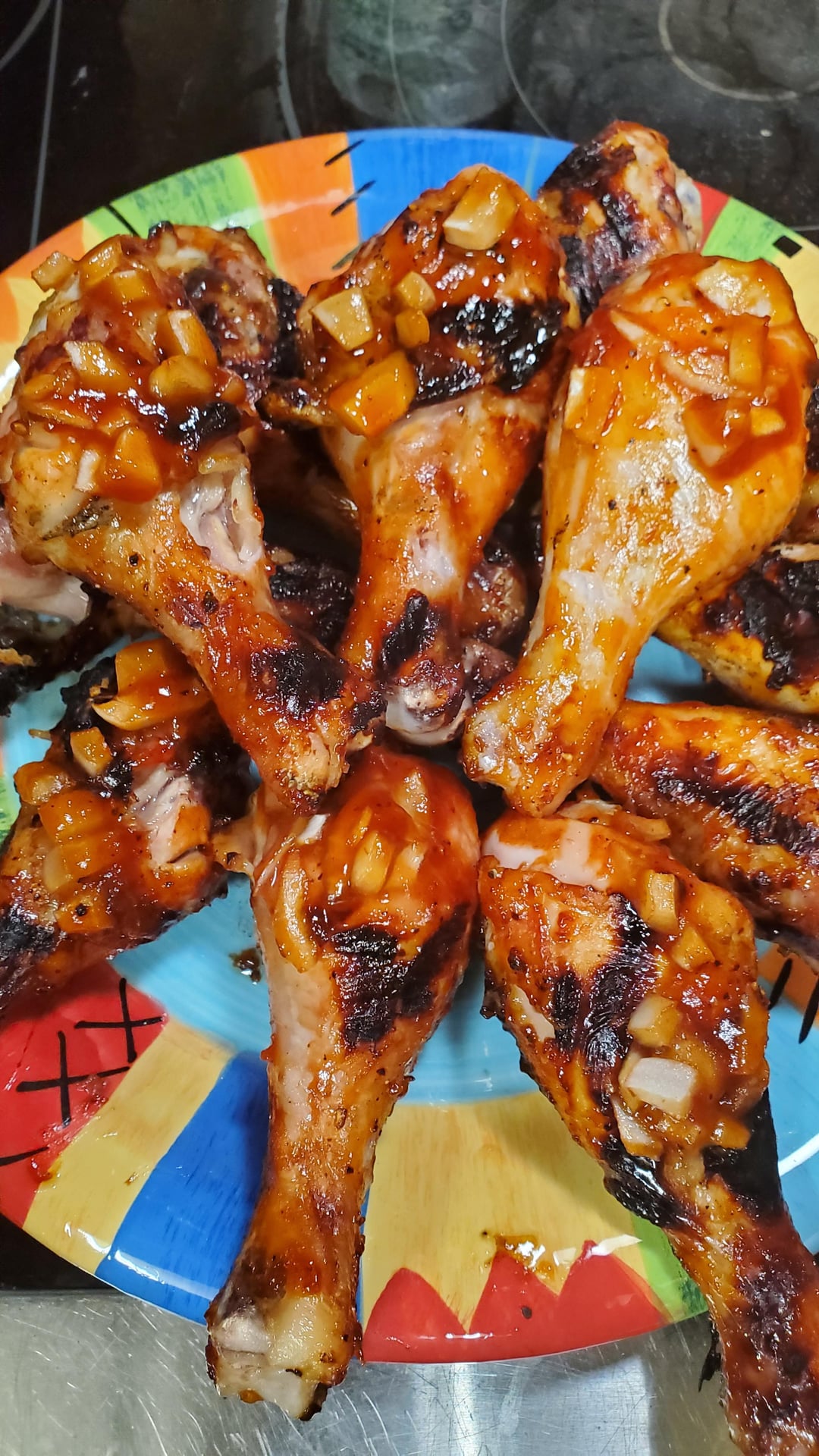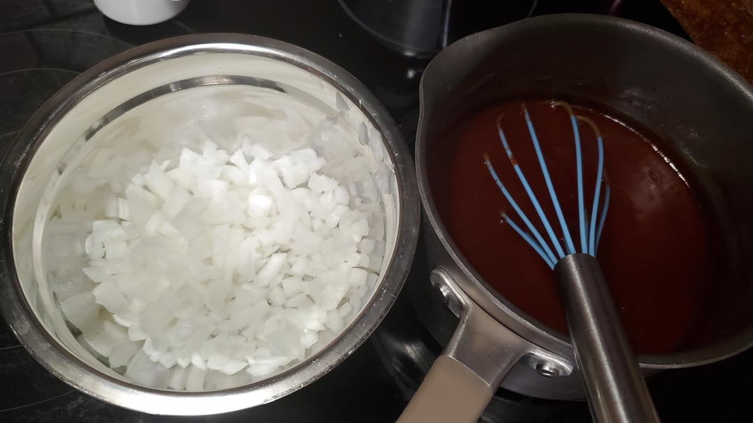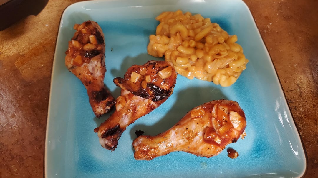 Homemade BBQ sauce. Onions added to sauce then stuck to chicken while it cooks. Result 11 out of 10. Took leftover onions and BBQ sauce and mac and cheese and simmered together.. 6 out of 10. Needed to cook the onions in the sauce longer before adding the mac and cheese. Still ate every bite. Needed to let it cool a bit before eating it was Lava Chicken.