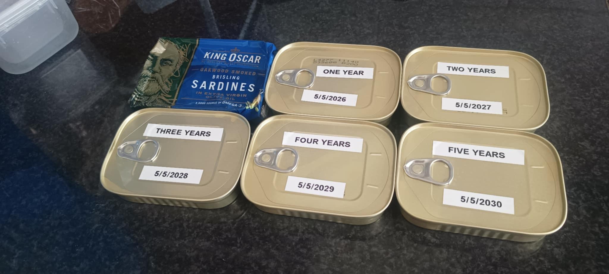 Ok. So in one year you’ll need to buy 5 cans, in two years four cans and so on. Then after five years you’ll have a complete vertical tasting every year. Essentially able to view and compare cans: fresh, one year old, two year old and so on. Good luck soldier.