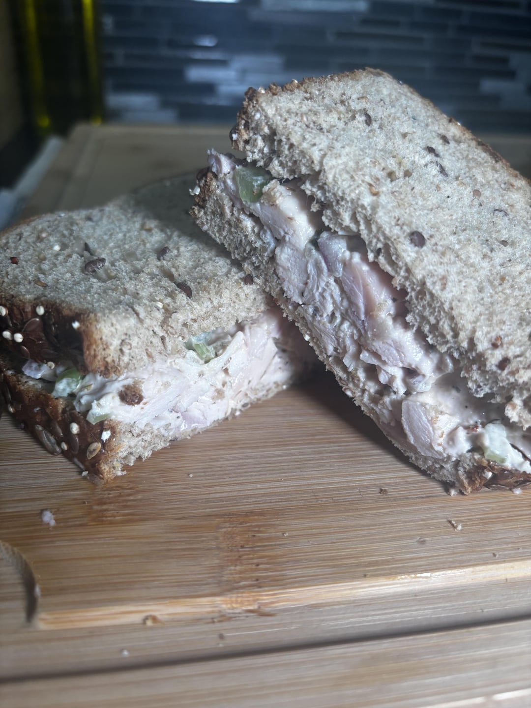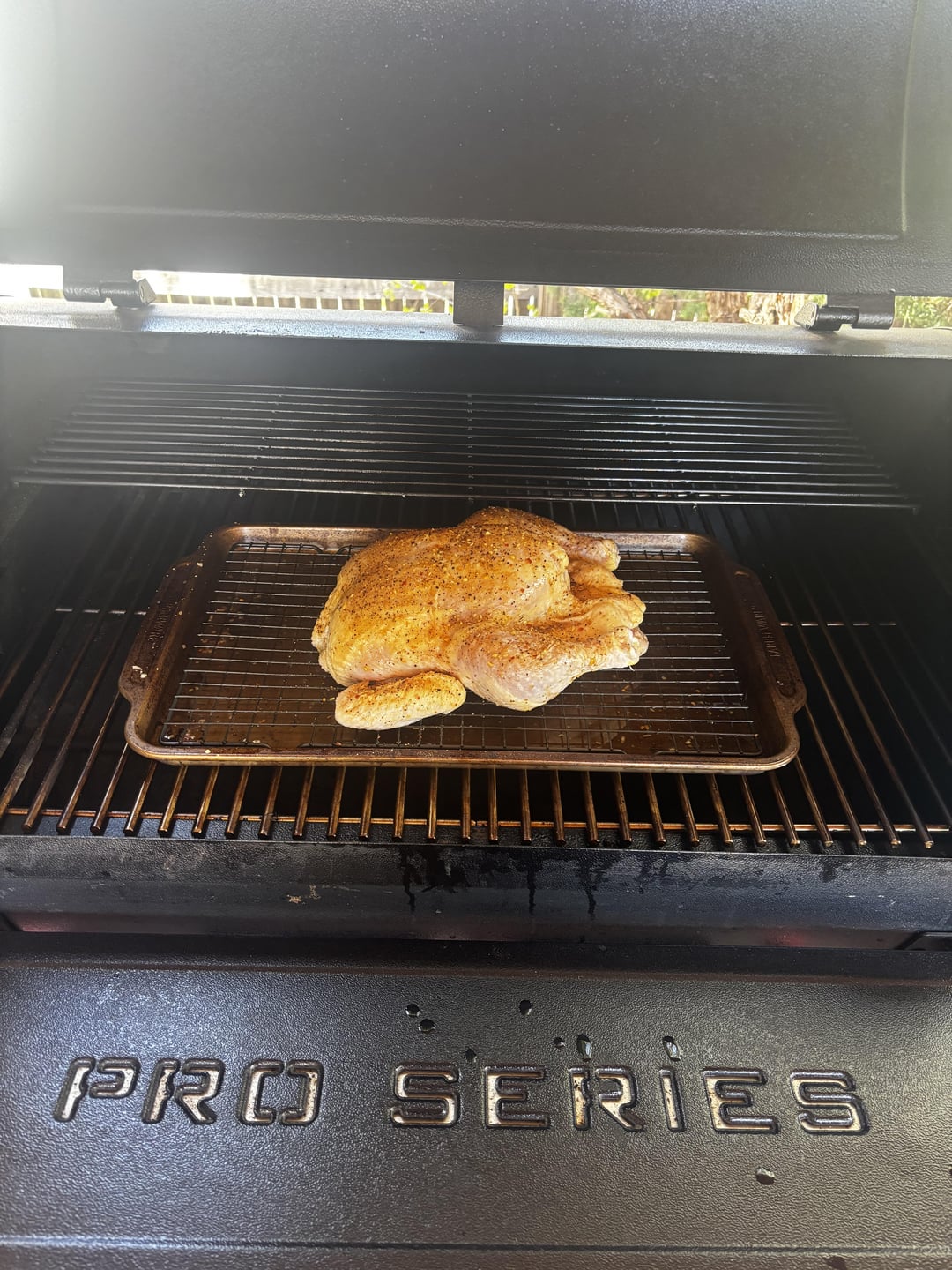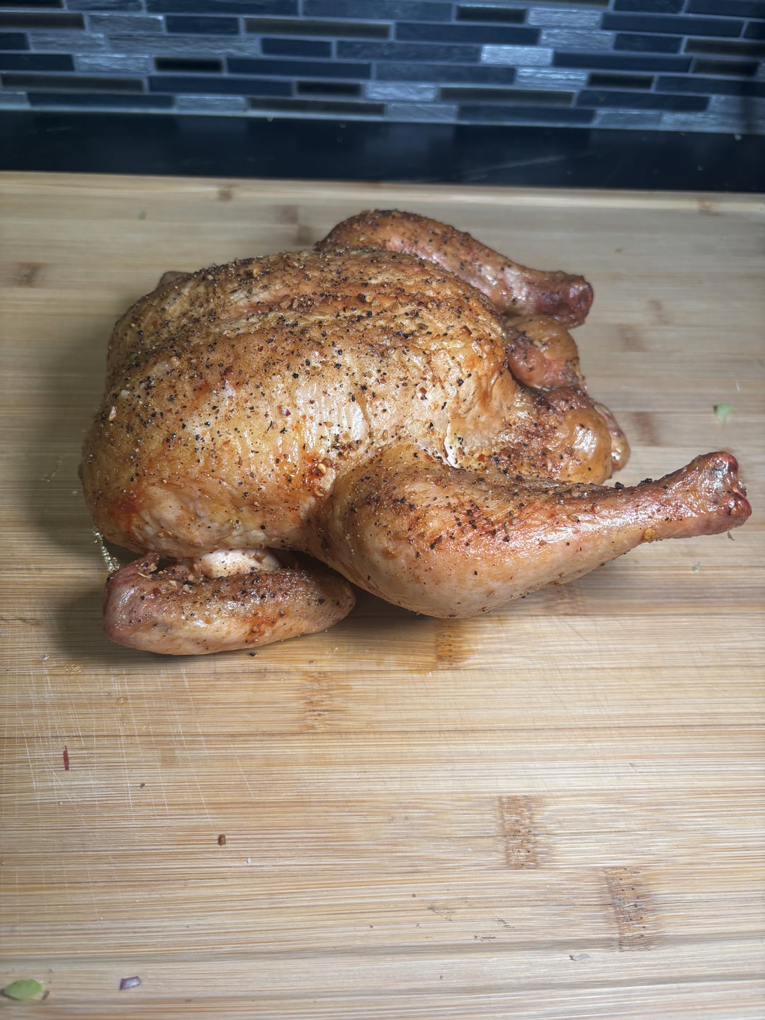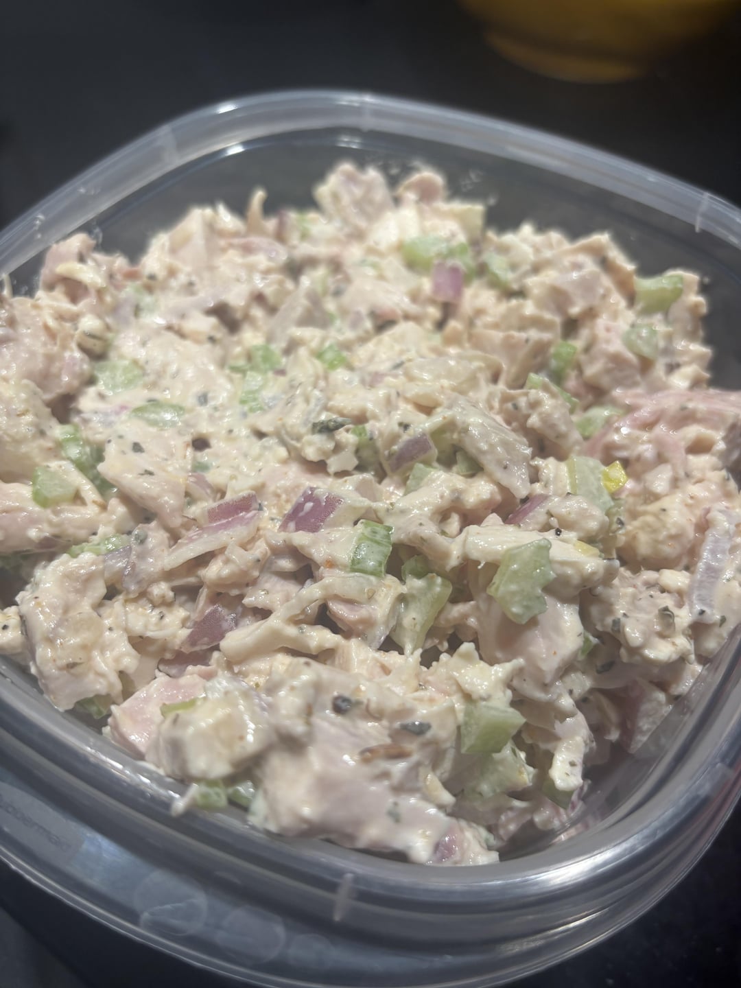 Pat dry chicken. Rub with olive oil binder. Generously season with rub of choice. I smoked at 240 for 5 hours until I achieved 165 internal. Times may vary. Strip meat and dice and add to bowl. I diced half a red onion, 3 celery sticks, added 1/4 cup mayo, a squirt of half a lemon and added garlic powder, salt and pepper to taste. Let me know if you have any questions!