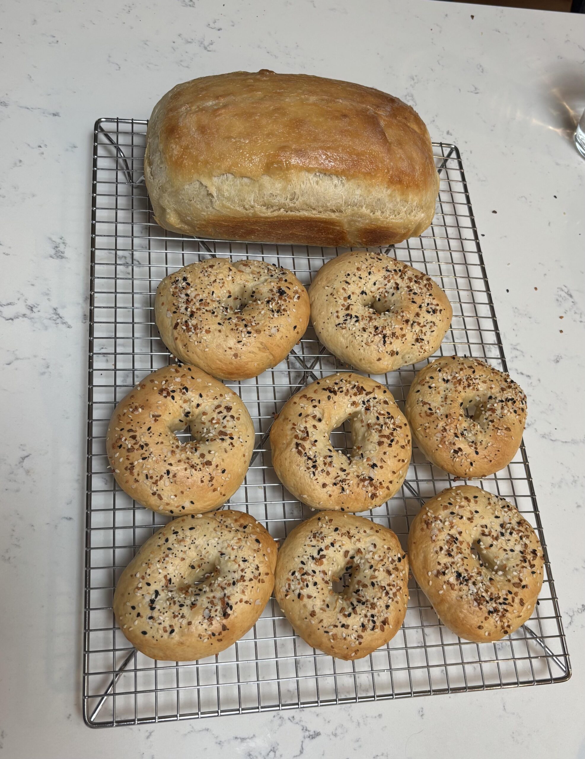 Been dabbling with baking bread and bagels for over a year with sourdough. It apparently doesn’t come naturally to me because I have struggled with it. I feel like I’m finally getting the hang of it, even though I’m still constantly learning how to adjust and make it better(or worse lol) every time. Here’s a picture of my bake today. Sandwich style loaf and some everything bagels for the week! I can share my recipe if anyone is interested just let me know!