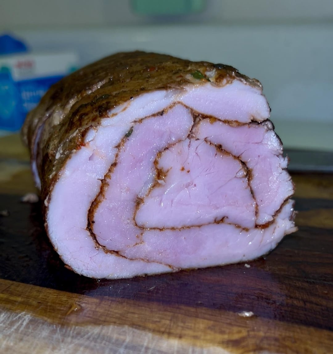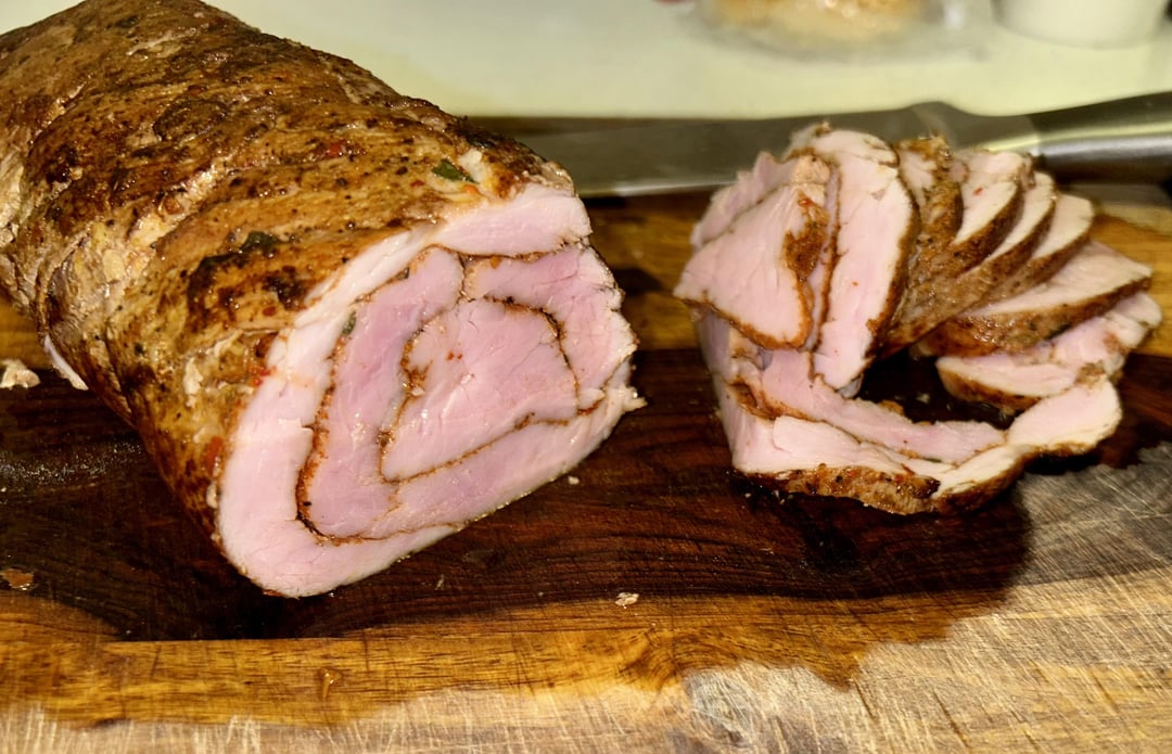 2 tenderloins sliced to sheets, seasoned, and twined together. Dry seasoned and marinated for 2 hours in the fridge. 135°f for 3.5 hours. Pan seer on stainless steel.